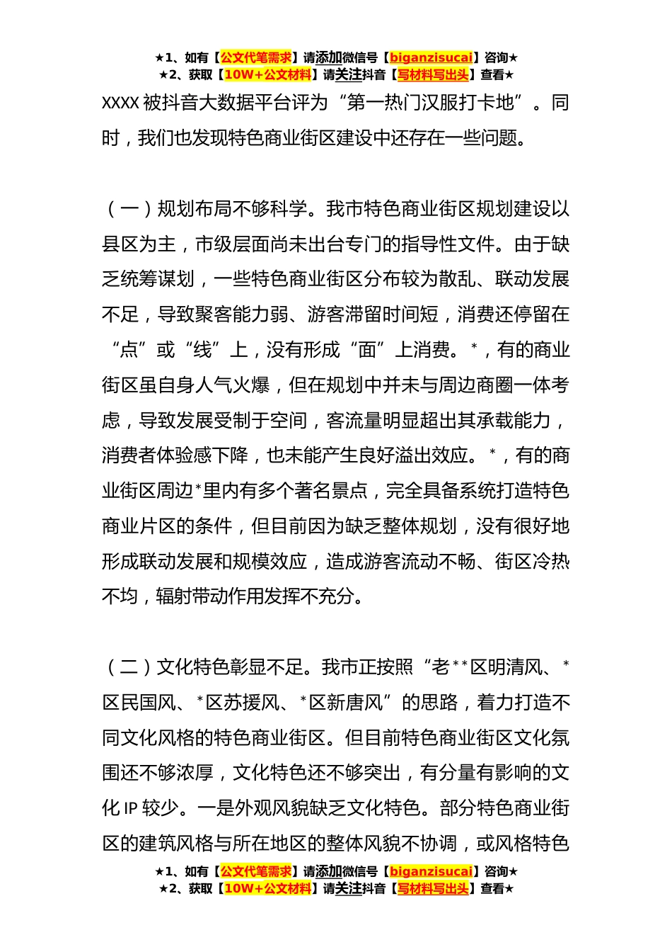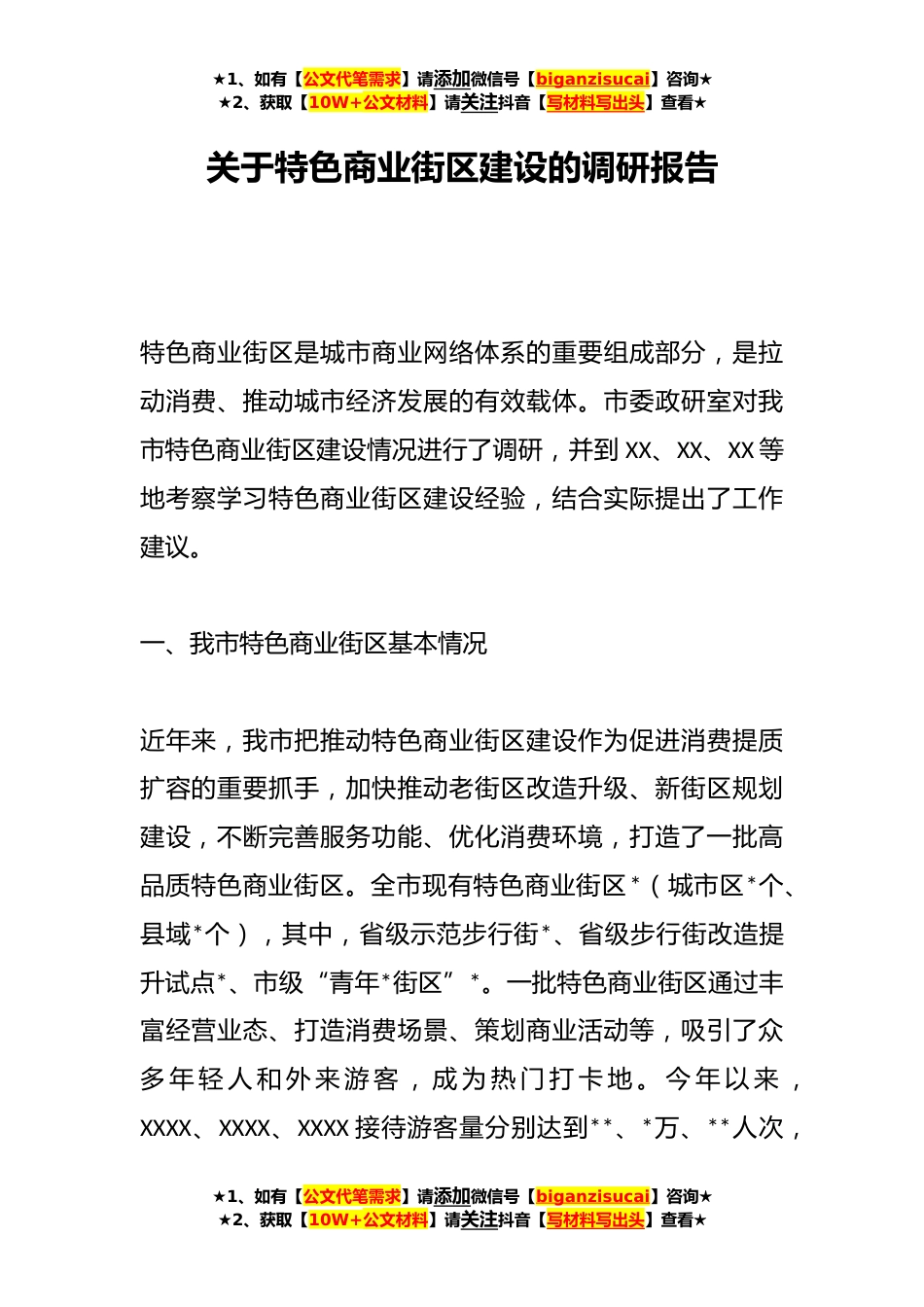 ★1、如有【公文代笔需求】请添加微信号【biganzisucai】咨询★★2、获取【10W+公文材料】请关注抖音【写材料写出头】查看★关于特色商业街区建设的调研报告特色商业街区是城市商业网络体系的重要组成部分,是拉动消费、推动城市经济发展的有效载体。市委政研室对我市特色商业街区建设情况进行了调研,并到XX、XX、XX等地考察学习特色商业街区建设经验,结合实际提出了工作建议。一、我市特色商业街区基本情况近年来,我市把推动特色商业街区建设作为促进消费提质扩容的重要抓手,加快推动老街区改造升级、新街区规划建设,不断完善服务功能、优化消费环境,打造了一批高品质特色商业街区。全市现有特色商业街区*(城市区*个、县域*个),其中,省级示范步行街*、省级步行街改造提升试点*、市级“青年*街区”*。一...