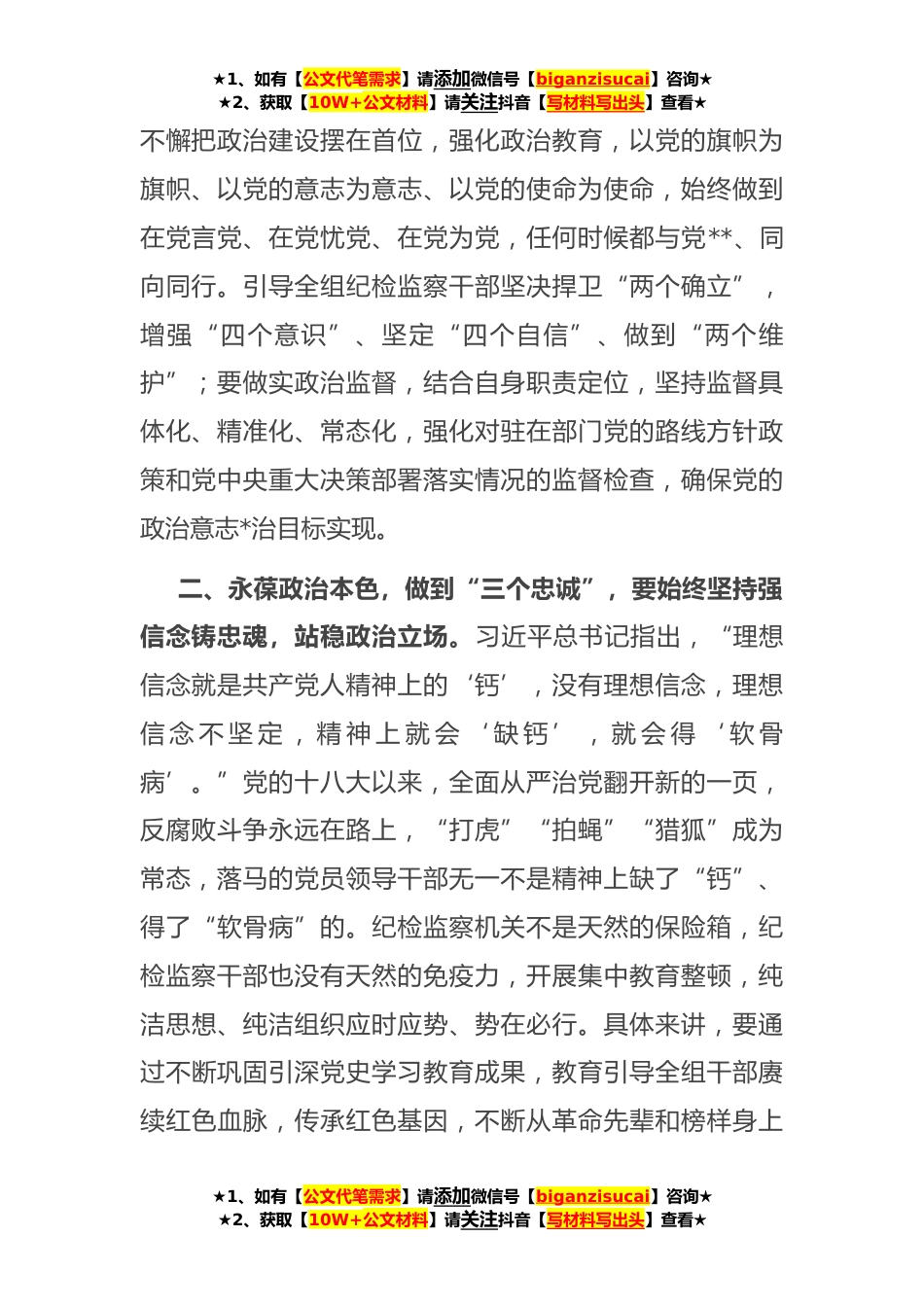 ★1、如有【公文代笔需求】请添加微信号【biganzisucai】咨询★★2、获取【10W+公文材料】请关注抖音【写材料写出头】查看★研讨发言:锤炼忠诚品格强化政治担当习近平总书记强调指出:“纪检监察机关和纪检监察干部要始终忠诚于党、忠诚于人民、忠诚于纪检监察事业。”“三个忠诚”,既是对新时代新征程纪检监察干部的政治要求,也是纪检监察机关的政治传统、根脉本色。一、永葆政治本色,做到“三个忠诚”,要始终坚持听党话跟党走,坚定政治方向。习近平总书记指出:“办好中国的事情,关键在党,关键在坚持党要管党、全面从严治党。”无数的事实证明,只要听党话跟党走,党和人民的事业就能迈过一道道险坎、走向一个个胜利。新时代新征程党的话就是习近平总书记重要讲话重要指示批示精神和党中央的重大决策部...