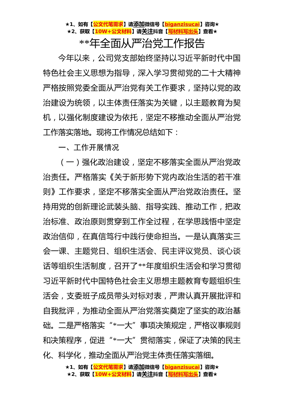 ★1、如有【公文代笔需求】请添加微信号【biganzisucai】咨询★★2、获取【10W+公文材料】请关注抖音【写材料写出头】查看★**年全面从严治党工作报告今年以来,公司党支部始终坚持以习近平新时代中国特色社会主义思想为指导,深入学习贯彻党的二十大精神严格按照党委全面从严治党有关工作要求,坚持以党的政治建设为统领,以主体责任落实为关键,以主题教育为契机,以强化制度建设为依托,坚定不移推动全面从严治党工作落实落地。现将工作情况总结如下:一、工作开展情况(一)强化政治建设,坚定不移落实全面从严治党政治责任。严格落实《关于新形势下党内政治生活的若干准则》工作要求,坚定不移落实全面从严治党政治责任。坚持用党的创新理论武装头脑、指导实践、推动工作,把政治标准、政治原则贯穿到工作全...