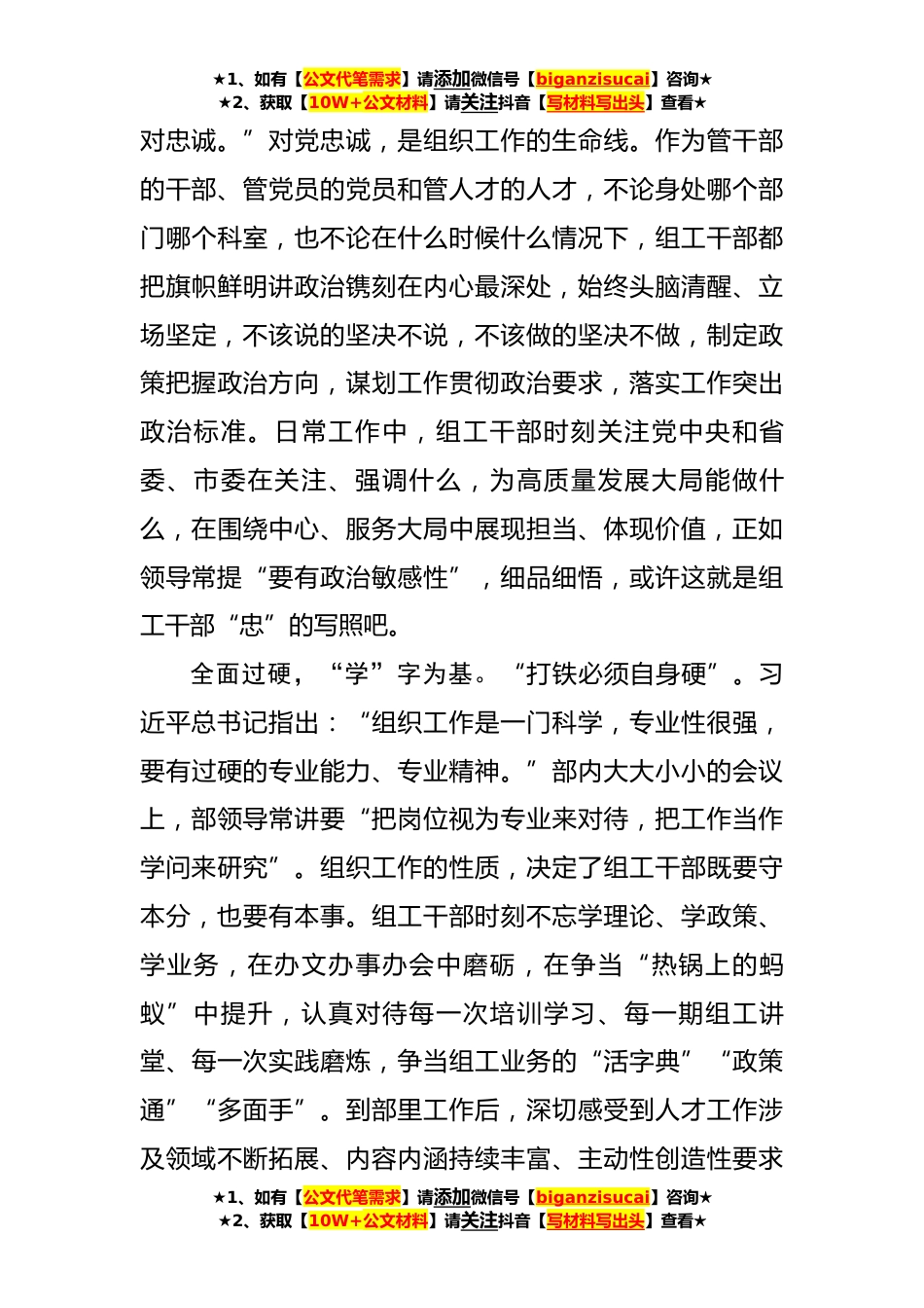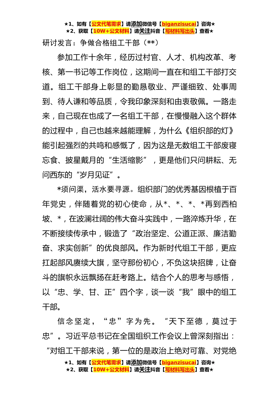 ★1、如有【公文代笔需求】请添加微信号【biganzisucai】咨询★★2、获取【10W+公文材料】请关注抖音【写材料写出头】查看★研讨发言:争做合格组工干部(**)参加工作十余年,经历过村官、人才、机构改革、考核、第一书记等工作岗位,这期间一直在和组工干部打交道。组工干部身上彰显的勤恳敬业、严谨细致、处事周到、待人谦和等品质,令我印象深刻和由衷敬佩。一路走来,自己现在也成了一名组工干部,在慢慢融入这个群体的过程中,自己也越来越能理解,为什么《组织部的灯》能引起强烈的共鸣和感慨了,因为这是无数组工干部废寝忘食、披星戴月的“生活缩影”,更是他们只问耕耘、无问西东的“岁月见证”。*须问渠,活水要寻源。组织部门的优秀基因根植于百年党史,伴随着党的初心使命,从*、*、*、*再到西柏坡、...