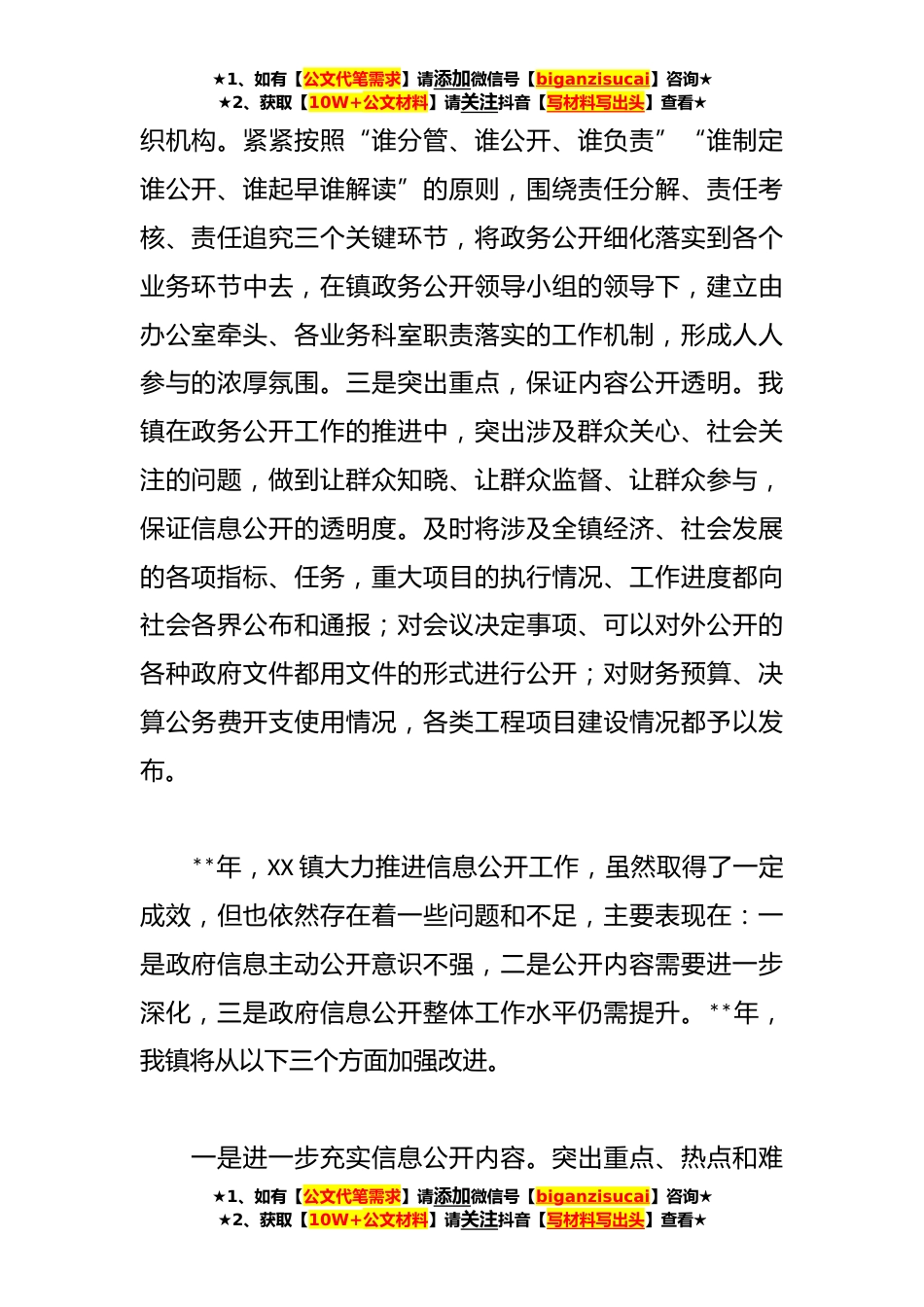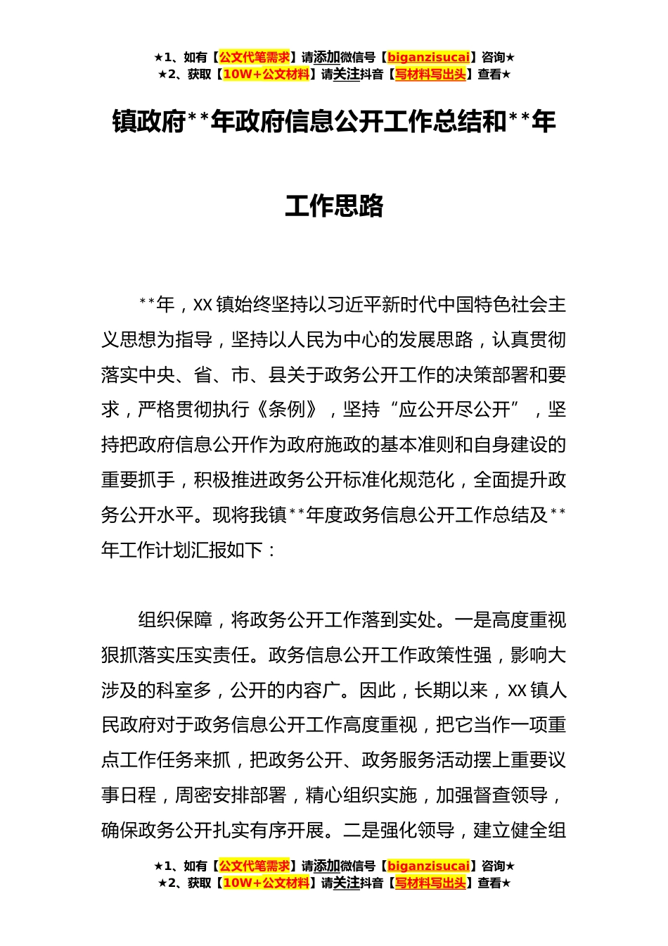 ★1、如有【公文代笔需求】请添加微信号【biganzisucai】咨询★★2、获取【10W+公文材料】请关注抖音【写材料写出头】查看★镇政府**年政府信息公开工作总结和**年工作思路**年,XX镇始终坚持以习近平新时代中国特色社会主义思想为指导,坚持以人民为中心的发展思路,认真贯彻落实中央、省、市、县关于政务公开工作的决策部署和要求,严格贯彻执行《条例》,坚持“应公开尽公开”,坚持把政府信息公开作为政府施政的基本准则和自身建设的重要抓手,积极推进政务公开标准化规范化,全面提升政务公开水平。现将我镇**年度政务信息公开工作总结及**年工作计划汇报如下:组织保障,将政务公开工作落到实处。一是高度重视狠抓落实压实责任。政务信息公开工作政策性强,影响大涉及的科室多,公开的内容广。因此,长期以...