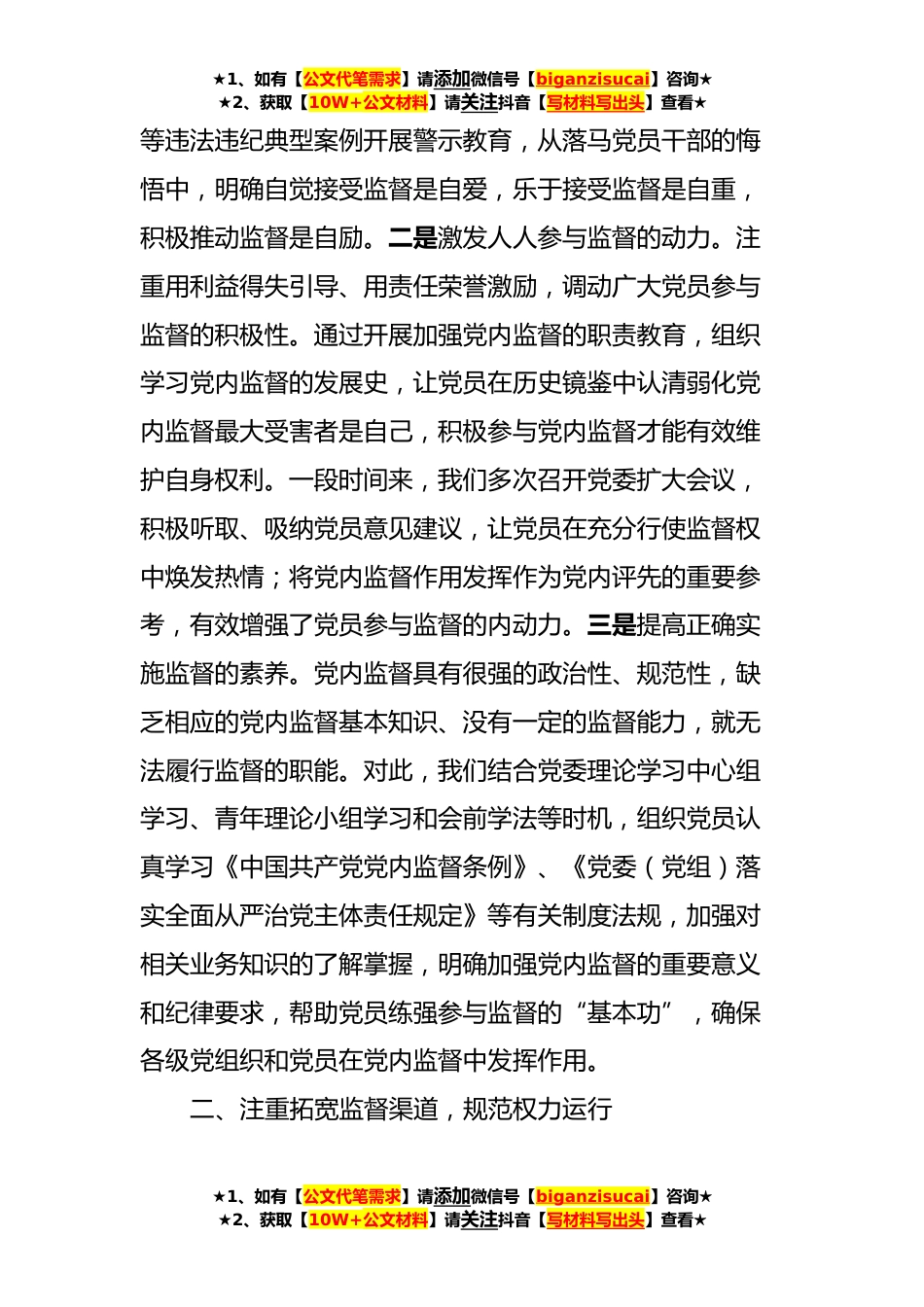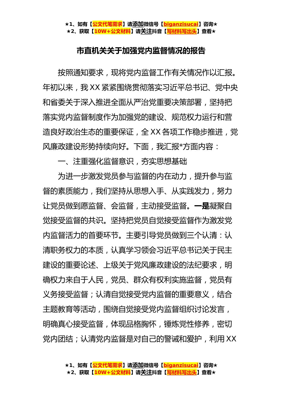 ★1、如有【公文代笔需求】请添加微信号【biganzisucai】咨询★★2、获取【10W+公文材料】请关注抖音【写材料写出头】查看★市直机关关于加强党内监督情况的报告按照通知要求,现将党内监督工作有关情况作以汇报。年初以来,我XX紧紧围绕贯彻落实习近平总书记、党中央和省委关于深入推进全面从严治党重要决策部署,坚持把落实党内监督制度作为加强党的建设、规范权力运行和营造良好政治生态的重要保证,全XX各项工作稳步推进,党风廉政建设形势持续向好。下面,我汇报*方面内容:一、注重强化监督意识,夯实思想基础为进一步激发党员参与监督的内在动力,提升参与监督的素质能力,我们坚持从思想入手、从实践发力,努力让党员做到愿监督、会监督,主动接受监督。一是凝聚自觉接受监督的共识。坚持把党员自觉接受监...
