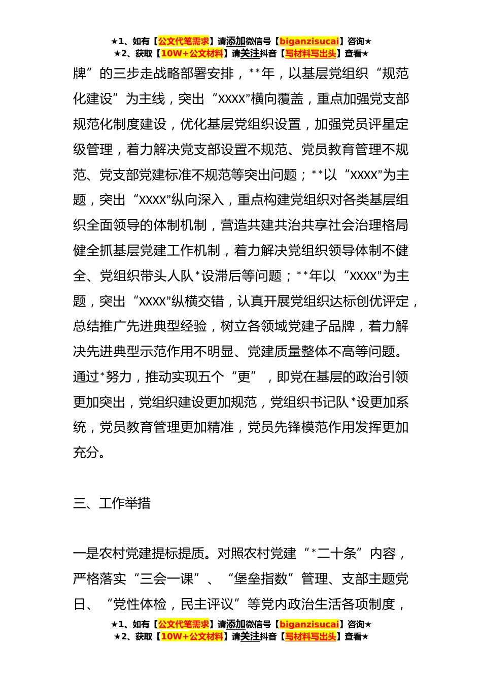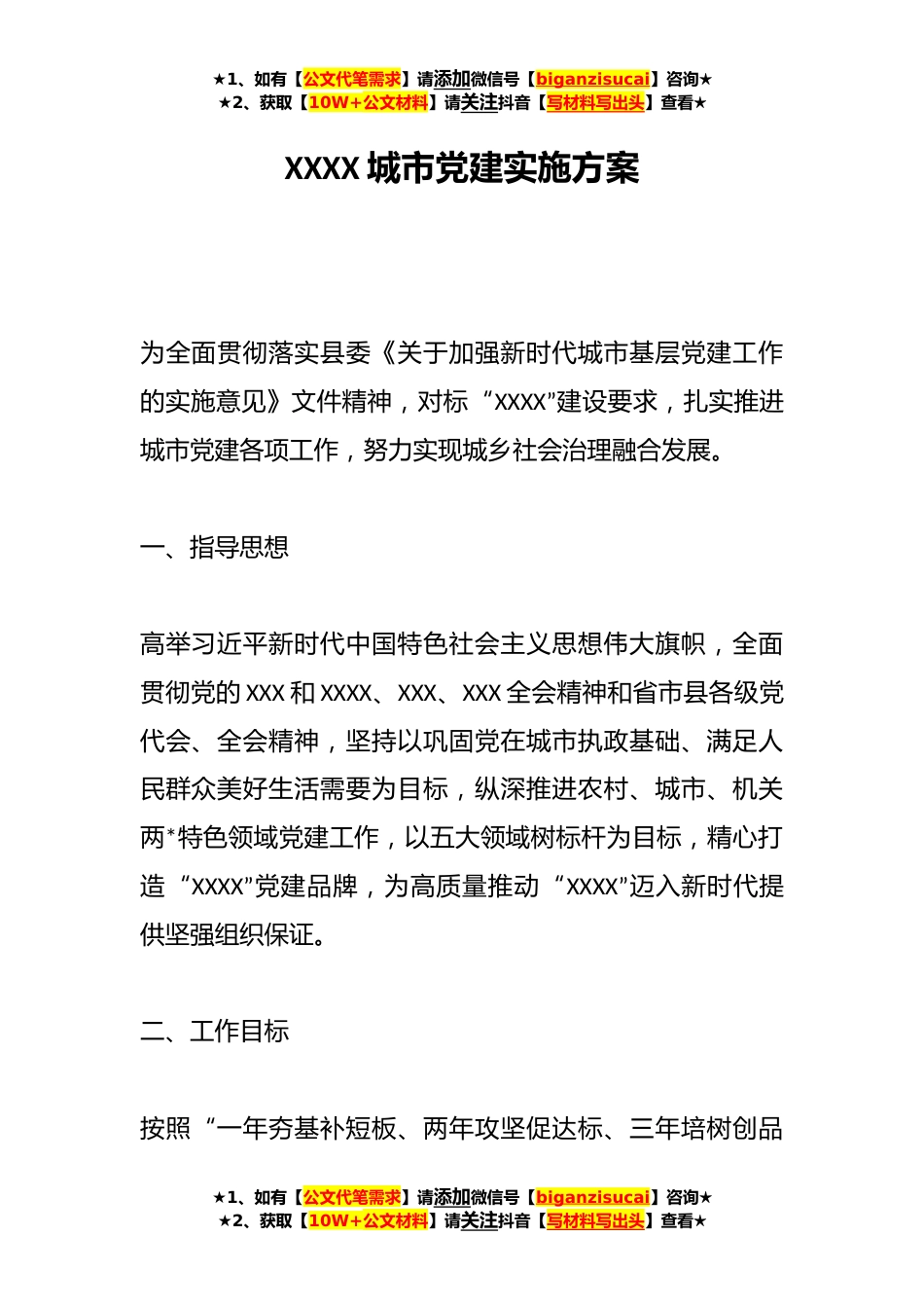 ★1、如有【公文代笔需求】请添加微信号【biganzisucai】咨询★★2、获取【10W+公文材料】请关注抖音【写材料写出头】查看★XXXX城市党建实施方案为全面贯彻落实县委《关于加强新时代城市基层党建工作的实施意见》文件精神,对标“XXXX”建设要求,扎实推进城市党建各项工作,努力实现城乡社会治理融合发展。一、指导思想高举习近平新时代中国特色社会主义思想伟大旗帜,全面贯彻党的XXX和XXXX、XXX、XXX全会精神和省市县各级党代会、全会精神,坚持以巩固党在城市执政基础、满足人民群众美好生活需要为目标,纵深推进农村、城市、机关两*特色领域党建工作,以五大领域树标杆为目标,精心打造“XXXX”党建品牌,为高质量推动“XXXX”迈入新时代提供坚强组织保证。二、工作目标按照“一年夯基补短板、两年攻坚促达...