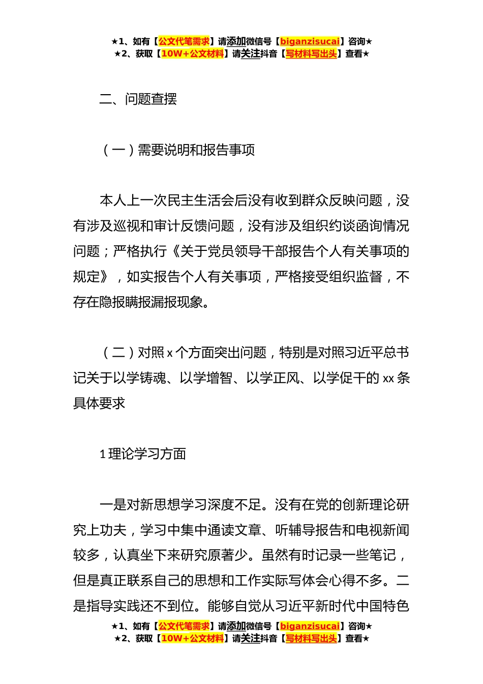 ★1、如有【公文代笔需求】请添加微信号【biganzisucai】咨询★★2、获取【10W+公文材料】请关注抖音【写材料写出头】查看★**年主题教育民主生活会个人对照检查材料(*根据据自治区林业局主题教育办和场党委的安排,我紧紧围绕此次专题民主生活会的主题,在认真学习、在广泛征求各方意见并进行深入的谈心谈话基础上,经过认真查找和审视自身存在的问题和不足之处,对问题产生的根源进行了深刻剖析。在此基础上,提出了努力方向和改进措施,现将有关情况汇报如下:一、上一年度民主生活会整改落实情况针对**年度民主生活会上检视查摆出的*方面的*问题,通过认真检视查摆问题、开展批评和自我批评、民主评议等,本人进行深入总结,制定整改方案,按要求进行整改目前已全部完成整改。★1、如有【公文代笔需求】请添...