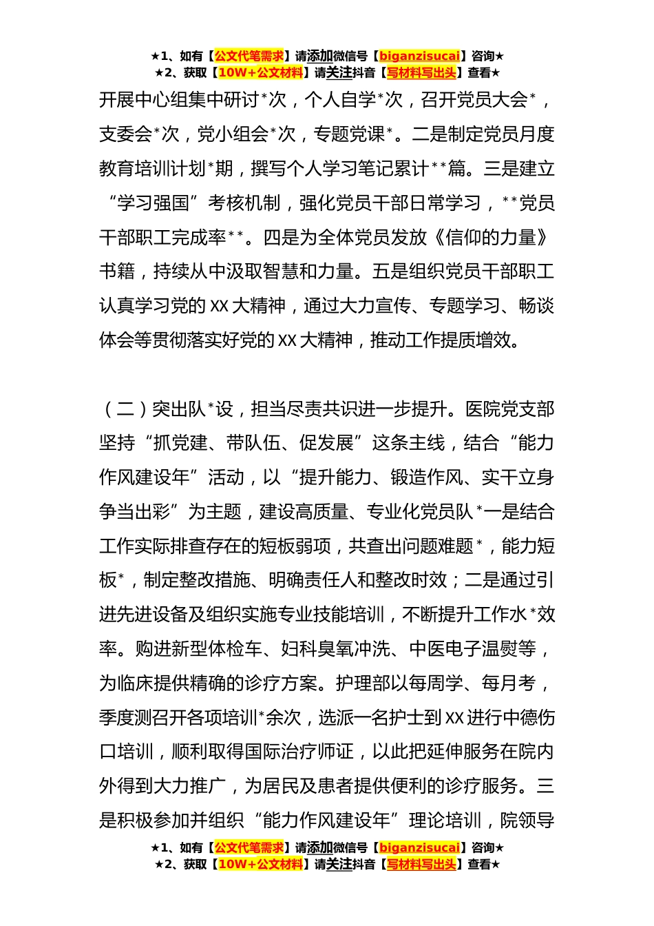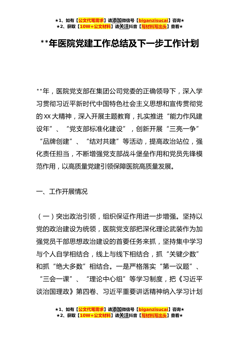 ★1、如有【公文代笔需求】请添加微信号【biganzisucai】咨询★★2、获取【10W+公文材料】请关注抖音【写材料写出头】查看★**年医院党建工作总结及下一步工作计划**年,医院党支部在集团公司党委的正确领导下,深入学习贯彻习近平新时代中国特色社会主义思想和宣传贯彻党的XX大精神,深入开展主题教育,扎实推进“能力作风建设年”、“党支部标准化建设”,创新开展“三亮一争”“品牌创建”、“结对共建”等活动,提高政治站位,强化责任担当,不断增强党支部战斗堡垒作用和党员先锋模范作用,以高质量党建引领保障医院高质量发展。一、工作开展情况(一)突出政治引领,组织保证作用进一步增强。坚持以党的政治建设为统领,医院党支部把深化理论武装作为加强党员干部思想政治建设的首要任务来抓,坚持集中学习...
