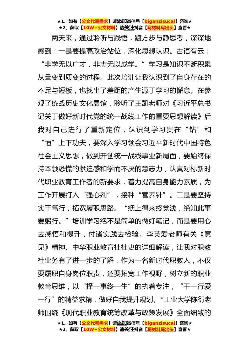 ★1、如有【公文代笔需求】请添加微信号【biganzisucai】咨询★★2、获取【10W+公文材料】请关注抖音【写材料写出头】查看★在*中华职教社第六届社务委员会成员及骨干干部培训班上的发言(**年*月*)秋收冬藏,万物美好。在这个温暖的冬日,我们相聚于此,共绘新起点、新未来,成为彼此的阳光。非常有幸参加*中华职教社此次培训与学习,与在座的*位同学一起在美好温馨的省社会主义学院相识相聚,一起在理论滋养中坚定了理想信念,一起在交流研讨中提高了党性修养,一起在课堂实践中增长了干事担当的本领。“不登高山,不知天之高;不临深溪,不知地之厚。”两日时光虽短暂但真理的味道却非常甜,给予我的不仅有唯学无际的知识视野,更有靡故匪新的思维方式、勇于探索的求知心态。下面就此次培训感悟作如下汇报:一...