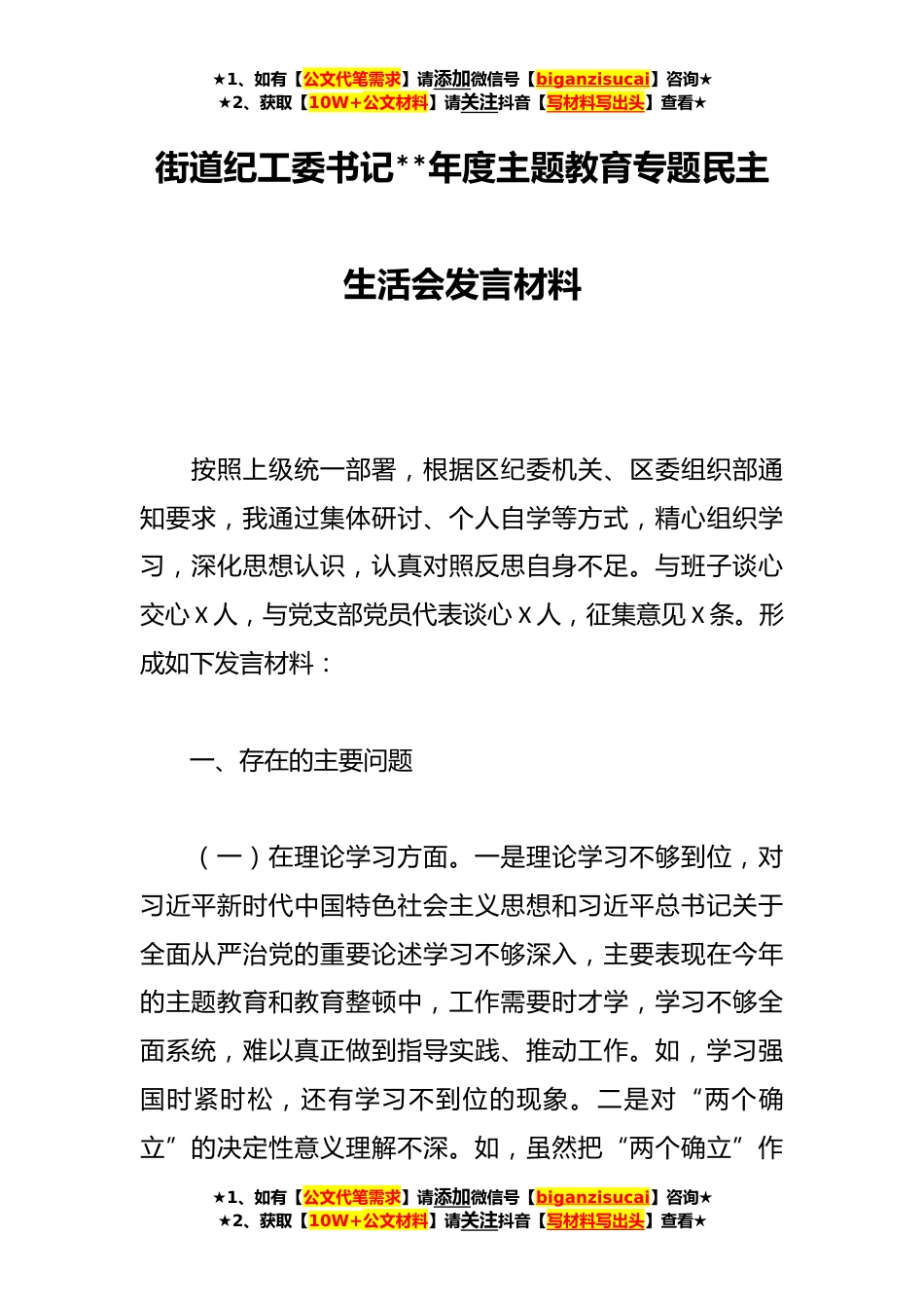★1、如有【公文代笔需求】请添加微信号【biganzisucai】咨询★★2、获取【10W+公文材料】请关注抖音【写材料写出头】查看★街道纪工委书记**年度主题教育专题民主生活会发言材料按照上级统一部署,根据区纪委机关、区委组织部通知要求,我通过集体研讨、个人自学等方式,精心组织学习,深化思想认识,认真对照反思自身不足。与班子谈心交心X人,与党支部党员代表谈心X人,征集意见X条。形成如下发言材料:一、存在的主要问题(一)在理论学习方面。一是理论学习不够到位,对习近平新时代中国特色社会主义思想和习近平总书记关于全面从严治党的重要论述学习不够深入,主要表现在今年的主题教育和教育整顿中,工作需要时才学,学习不够全面系统,难以真正做到指导实践、推动工作。如,学习强国时紧时松,还有学习不...