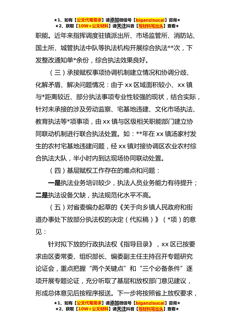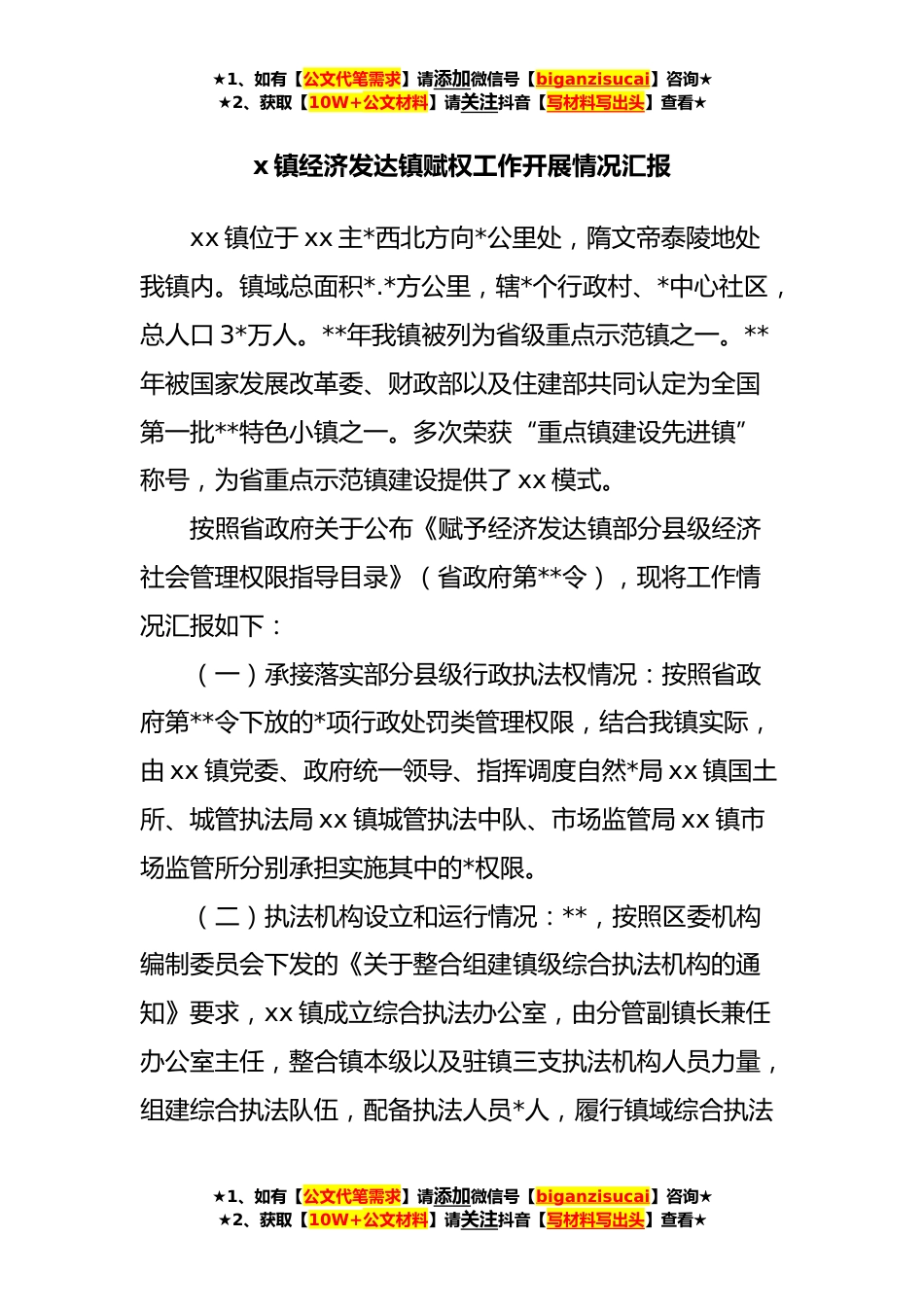 ★1、如有【公文代笔需求】请添加微信号【biganzisucai】咨询★★2、获取【10W+公文材料】请关注抖音【写材料写出头】查看★x镇经济发达镇赋权工作开展情况汇报xx镇位于xx主*西北方向*公里处,隋文帝泰陵地处我镇内。镇域总面积*.*方公里,辖*个行政村、*中心社区,总人口3*万人。**年我镇被列为省级重点示范镇之一。**年被国家发展改革委、财政部以及住建部共同认定为全国第一批**特色小镇之一。多次荣获“重点镇建设先进镇”称号,为省重点示范镇建设提供了xx模式。按照省政府关于公布《赋予经济发达镇部分县级经济社会管理权限指导目录》(省政府第**令),现将工作情况汇报如下:(一)承接落实部分县级行政执法权情况:按照省政府第**令下放的*项行政处罚类管理权限,结合我镇实际,由xx镇党委、政府统一领导...