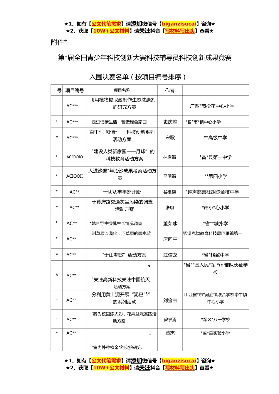 ★1、如有【公文代笔需求】请添加微信号【biganzisucai】咨询★★2、获取【10W+公文材料】请关注抖音【写材料写出头】查看★附件*第*届全国青少年科技创新大赛科技辅导员科技创新成果竟赛入围决赛名单(按项目编号排序)号项目编号项目名称作者AC***刂用植物提取液制作生态洗涤剂的研宄方案广匹*市松花中心小学*AC***走进低碳生活,营造绿色家园史庆峰*省*市*镇中心小学*AC***百里*,风情*一一科技创新系列活动方案宋歌**高级中学*ACIOOIO“建设人类新家园一一月球”的科技教育活动方案林启福*省*县第一中学*ACIOOII人进沙退*年治沙成果考察活动方案马明福**第四小学*AC**一切从丰年虾开始谷祖德*钟声慈善社胡陈金枝中学*AC**于幕府路交通灰尘污染的调查活动方案张翔*市小*心小学*AC***地区野生樱桃生长情况调查董...