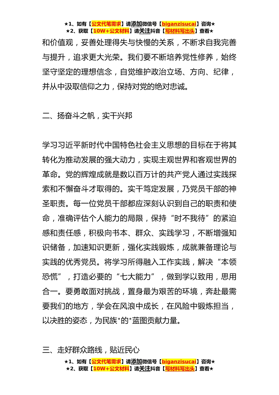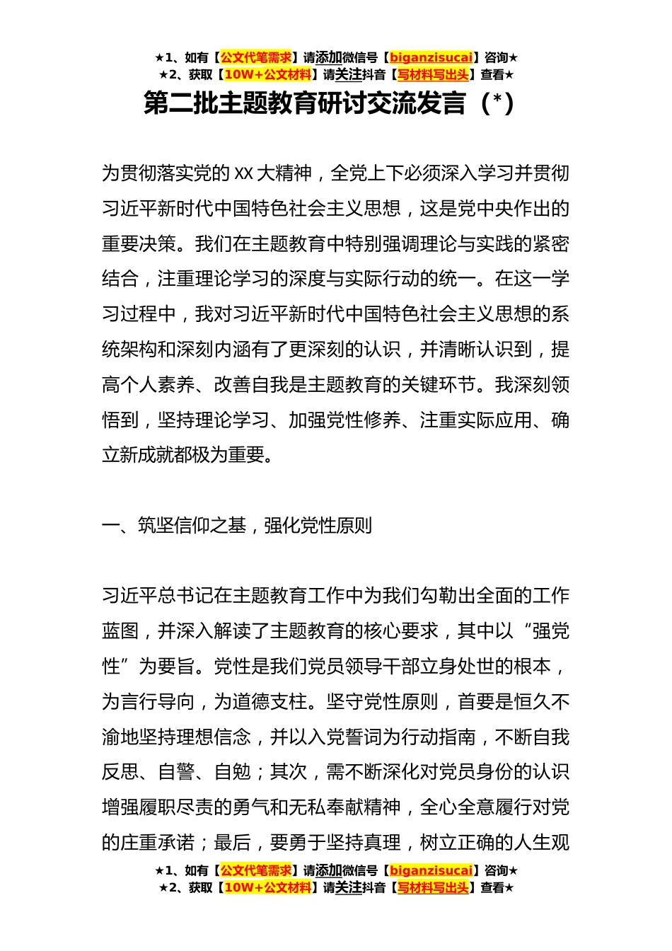 ★1、如有【公文代笔需求】请添加微信号【biganzisucai】咨询★★2、获取【10W+公文材料】请关注抖音【写材料写出头】查看★第二批主题教育研讨交流发言(*)为贯彻落实党的XX大精神,全党上下必须深入学习并贯彻习近平新时代中国特色社会主义思想,这是党中央作出的重要决策。我们在主题教育中特别强调理论与实践的紧密结合,注重理论学习的深度与实际行动的统一。在这一学习过程中,我对习近平新时代中国特色社会主义思想的系统架构和深刻内涵有了更深刻的认识,并清晰认识到,提高个人素养、改善自我是主题教育的关键环节。我深刻领悟到,坚持理论学习、加强党性修养、注重实际应用、确立新成就都极为重要。一、筑坚信仰之基,强化党性原则习近平总书记在主题教育工作中为我们勾勒出全面的工作蓝图,并深入解读...