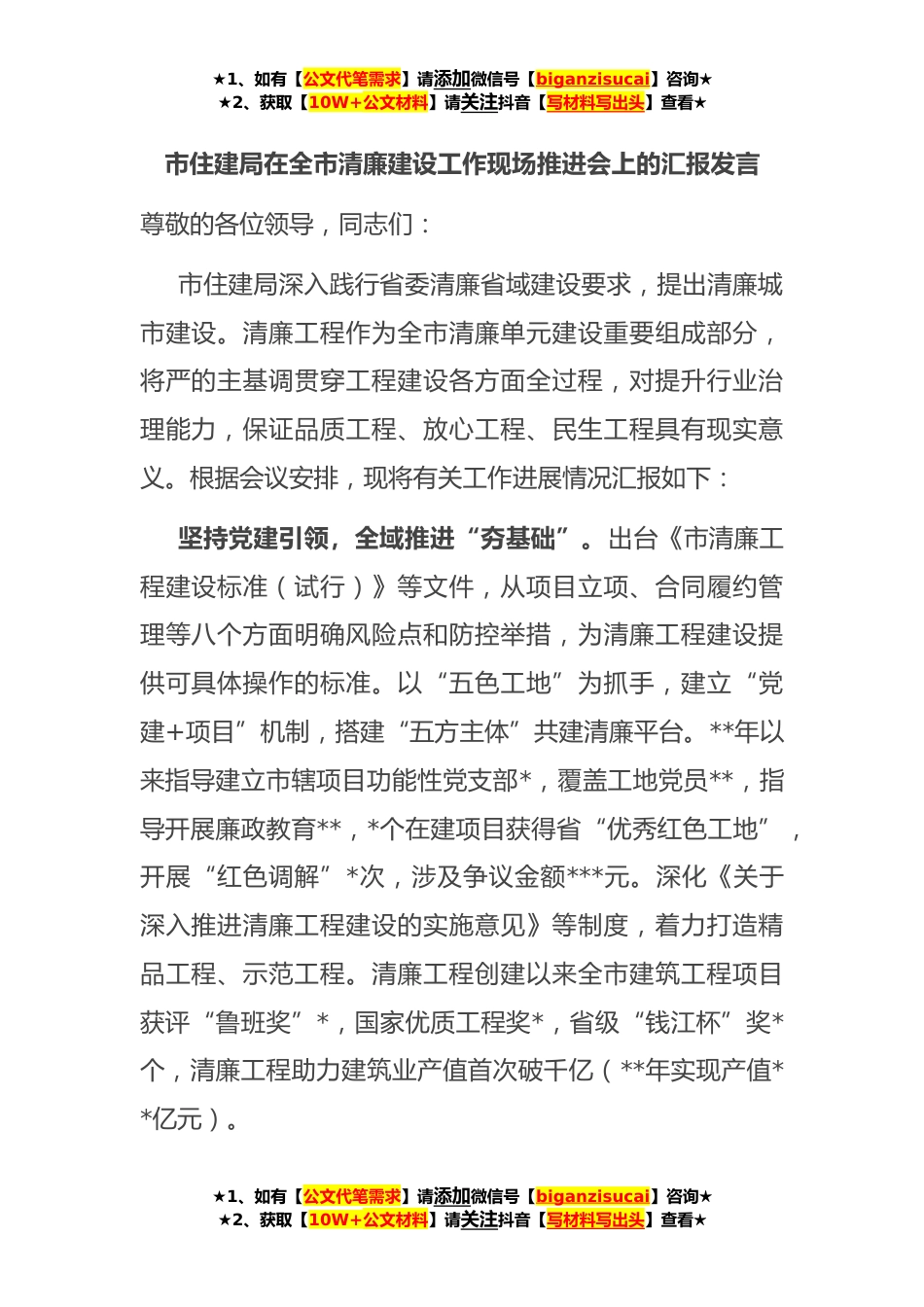 ★1、如有【公文代笔需求】请添加微信号【biganzisucai】咨询★★2、获取【10W+公文材料】请关注抖音【写材料写出头】查看★市住建局在全市清廉建设工作现场推进会上的汇报发言尊敬的各位领导,同志们:市住建局深入践行省委清廉省域建设要求,提出清廉城市建设。清廉工程作为全市清廉单元建设重要组成部分,将严的主基调贯穿工程建设各方面全过程,对提升行业治理能力,保证品质工程、放心工程、民生工程具有现实意义。根据会议安排,现将有关工作进展情况汇报如下:坚持党建引领,全域推进“夯基础”。出台《市清廉工程建设标准(试行)》等文件,从项目立项、合同履约管理等八个方面明确风险点和防控举措,为清廉工程建设提供可具体操作的标准。以“五色工地”为抓手,建立“党建+项目”机制,搭建“五方主体”...