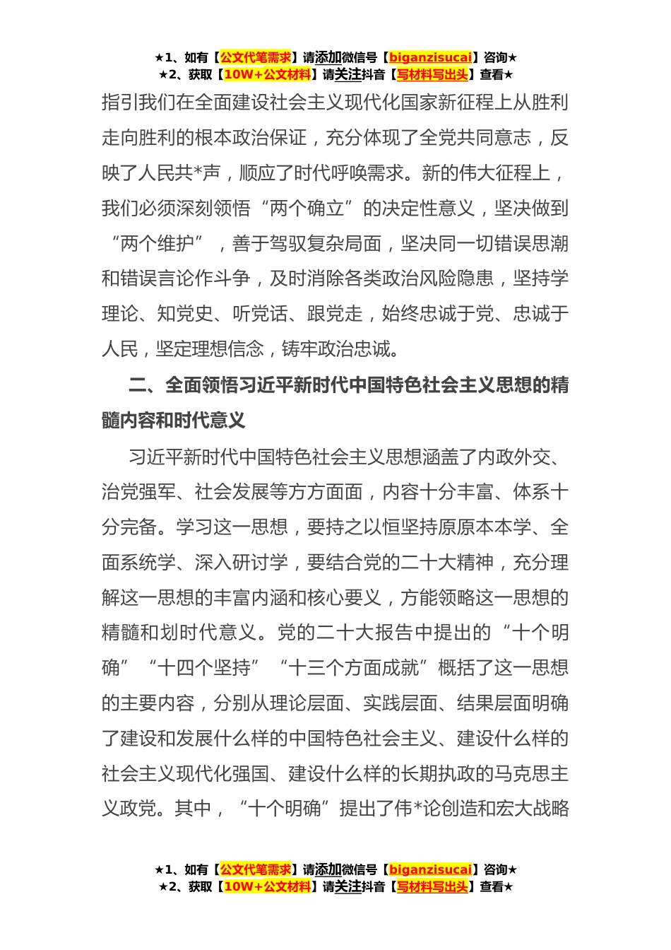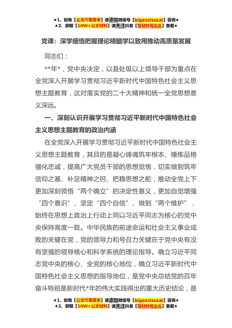 ★1、如有【公文代笔需求】请添加微信号【biganzisucai】咨询★★2、获取【10W+公文材料】请关注抖音【写材料写出头】查看★党课:深学细悟把握理论精髓学以致用推动高质量发展同志们:**年*,党中央决定,以县处级以上领导干部为重点在全党深入开展学习贯彻习近平新时代中国特色社会主义思想主题教育,这对落实党的二十大精神和统一全党思想意义深远。一、深刻认识开展学习贯彻习近平新时代中国特色社会主义思想主题教育的政治内涵在全党深入开展学习贯彻习近平新时代中国特色社会主义思想主题教育,其目的是凝心铸魂筑牢根本、锤炼品格强化忠诚,提高广大党员干部的思想觉悟,切实做到筑牢信仰之基、补足精神之钙、把稳思想之舵,推动全党上下更加深刻领悟“两个确立”的决定性意义,更加自觉增强“四个意识”、...