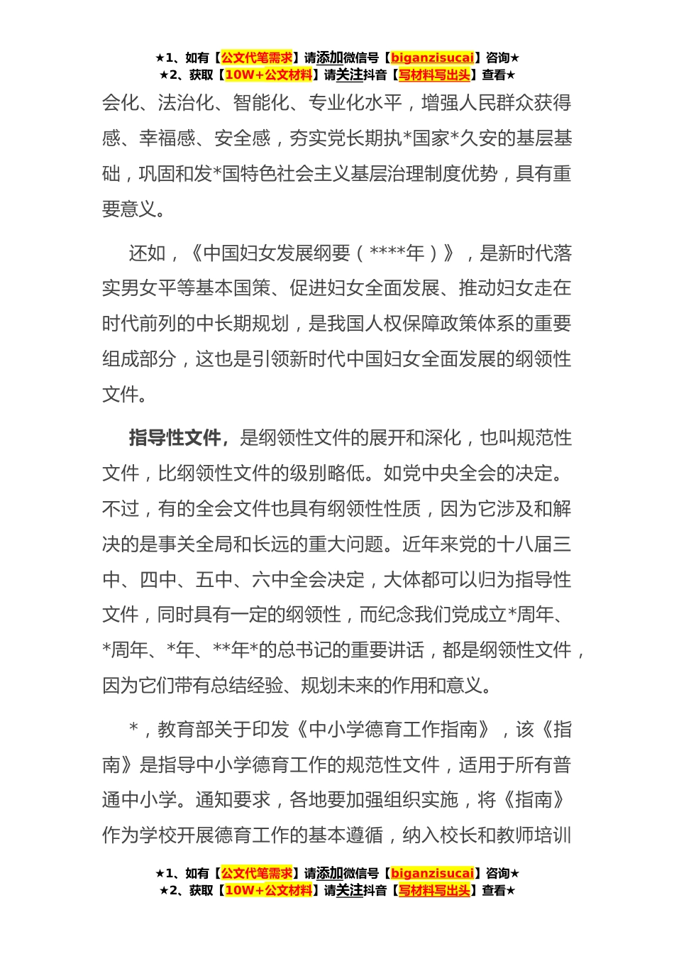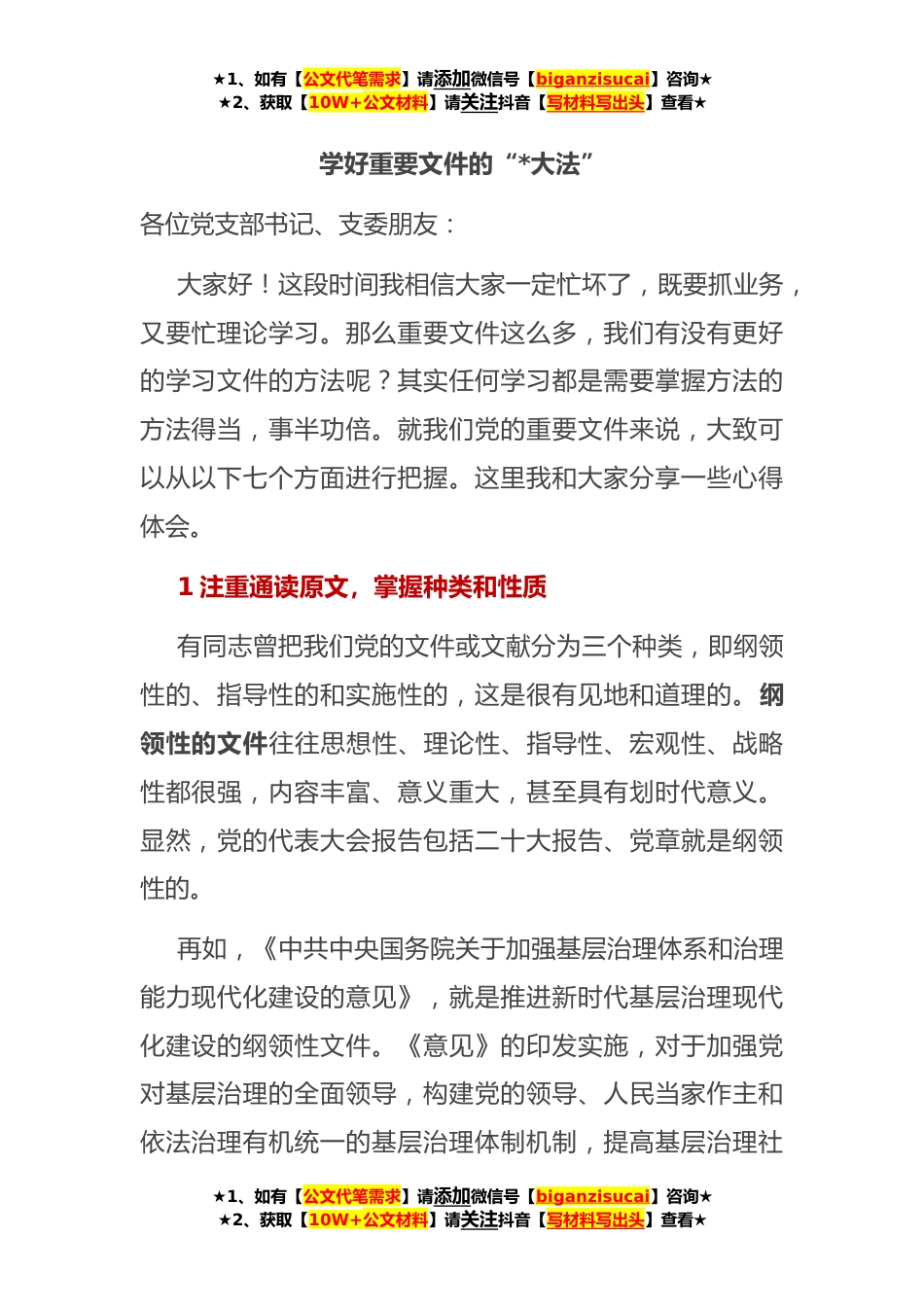 ★1、如有【公文代笔需求】请添加微信号【biganzisucai】咨询★★2、获取【10W+公文材料】请关注抖音【写材料写出头】查看★学好重要文件的“*大法”各位党支部书记、支委朋友:大家好!这段时间我相信大家一定忙坏了,既要抓业务,又要忙理论学习。那么重要文件这么多,我们有没有更好的学习文件的方法呢?其实任何学习都是需要掌握方法的方法得当,事半功倍。就我们党的重要文件来说,大致可以从以下七个方面进行把握。这里我和大家分享一些心得体会。1注重通读原文,掌握种类和性质有同志曾把我们党的文件或文献分为三个种类,即纲领性的、指导性的和实施性的,这是很有见地和道理的。纲领性的文件往往思想性、理论性、指导性、宏观性、战略性都很强,内容丰富、意义重大,甚至具有划时代意义。显然,党的代表...
