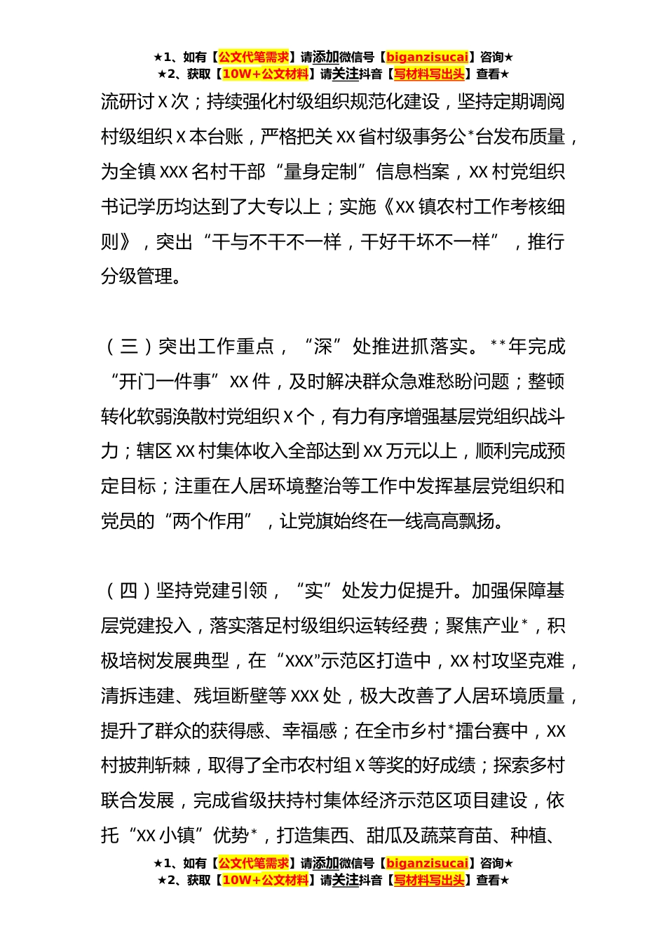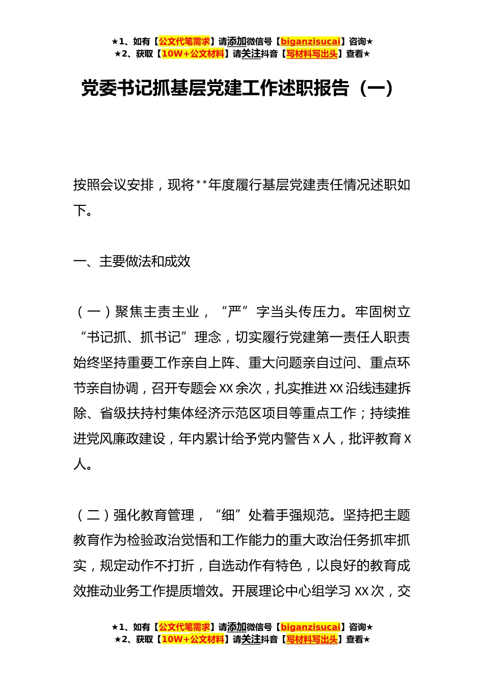 ★1、如有【公文代笔需求】请添加微信号【biganzisucai】咨询★★2、获取【10W+公文材料】请关注抖音【写材料写出头】查看★党委书记抓基层党建工作述职报告(一)按照会议安排,现将**年度履行基层党建责任情况述职如下。一、主要做法和成效(一)聚焦主责主业,“严”字当头传压力。牢固树立“书记抓、抓书记”理念,切实履行党建第一责任人职责始终坚持重要工作亲自上阵、重大问题亲自过问、重点环节亲自协调,召开专题会XX余次,扎实推进XX沿线违建拆除、省级扶持村集体经济示范区项目等重点工作;持续推进党风廉政建设,年内累计给予党内警告X人,批评教育X人。(二)强化教育管理,“细”处着手强规范。坚持把主题教育作为检验政治觉悟和工作能力的重大政治任务抓牢抓实,规定动作不打折,自选动作有特色,...
