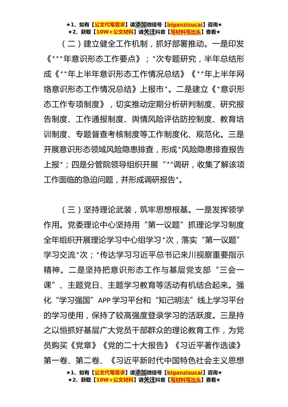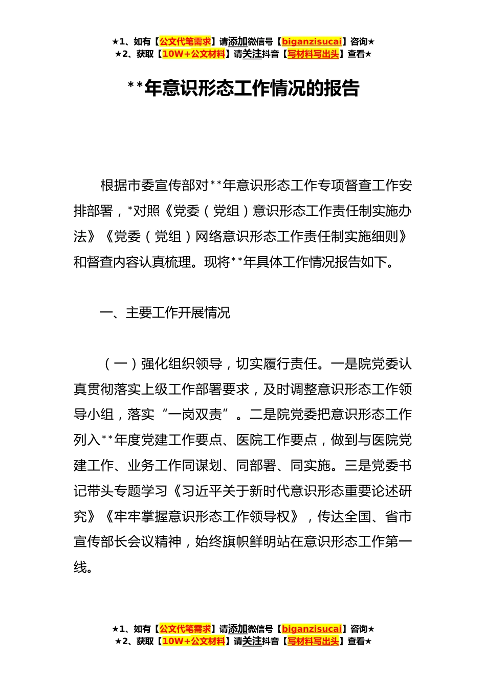 ★1、如有【公文代笔需求】请添加微信号【biganzisucai】咨询★★2、获取【10W+公文材料】请关注抖音【写材料写出头】查看★**年意识形态工作情况的报告根据市委宣传部对**年意识形态工作专项督查工作安排部署,*对照《党委(党组)意识形态工作责任制实施办法》《党委(党组)网络意识形态工作责任制实施细则》和督查内容认真梳理。现将**年具体工作情况报告如下。一、主要工作开展情况(一)强化组织领导,切实履行责任。一是院党委认真贯彻落实上级工作部署要求,及时调整意识形态工作领导小组,落实“一岗双责”。二是院党委把意识形态工作列入**年度党建工作要点、医院工作要点,做到与医院党建工作、业务工作同谋划、同部署、同实施。三是党委书记带头专题学习《习近平关于新时代意识形态重要论述研究》《牢...