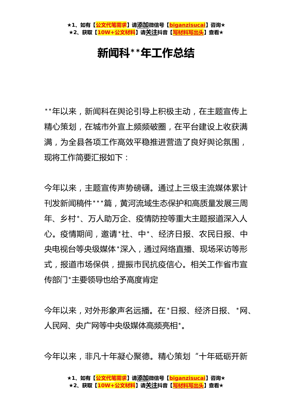★1、如有【公文代笔需求】请添加微信号【biganzisucai】咨询★★2、获取【10W+公文材料】请关注抖音【写材料写出头】查看★新闻科**年工作总结**年以来,新闻科在舆论引导上积极主动,在主题宣传上精心策划,在城市外宣上频频破圈,在平台建设上收获满满,为全县各项工作高效平稳推进营造了良好舆论氛围,现将工作简要汇报如下:今年以来,主题宣传声势磅礴。通过上三级主流媒体累计刊发新闻稿件***篇,黄河流域生态保护和高质量发展三周年、乡村*、万人助万企、疫情防控等重大主题报道深入人心。疫情期间,邀请*社、中*、经济日报、农民日报、中央电视台等央级媒体*深入,通过网络直播、现场采访等形式,报道市场保供,提振市民抗疫信心。相关工作省市宣传部门*主要领导也给予高度肯定今年以来,对外形象声名远...