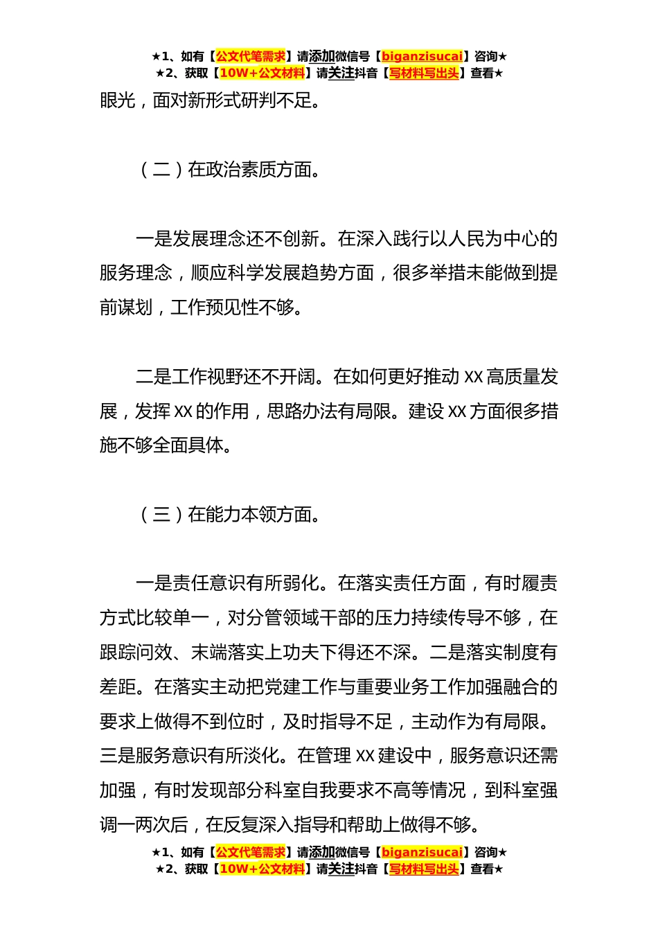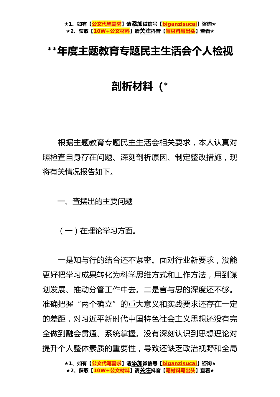 ★1、如有【公文代笔需求】请添加微信号【biganzisucai】咨询★★2、获取【10W+公文材料】请关注抖音【写材料写出头】查看★**年度主题教育专题民主生活会个人检视剖析材料(*根据主题教育专题民主生活会相关要求,本人认真对照检查自身存在问题、深刻剖析原因、制定整改措施,现将有关情况报告如下。一、查摆出的主要问题(一)在理论学习方面。一是知与行的结合还不紧密。面对行业新要求,没能更好把学习成果转化为科学思维方式和工作方法,用到谋划发展、推动分管工作中去。二是言与思的深度还不够。准确把握“两个确立”的重大意义和实践要求还存在一定的差距,对习近平新时代中国特色社会主义思想还没有完全做到融会贯通、系统掌握。没有深刻认识到思想理论对提升个人整体素质的重要性,导致还缺乏政治视野和...