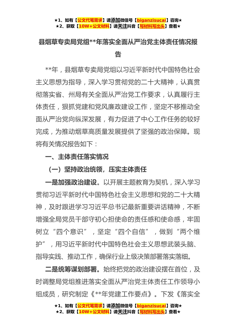 ★1、如有【公文代笔需求】请添加微信号【biganzisucai】咨询★★2、获取【10W+公文材料】请关注抖音【写材料写出头】查看★县烟草专卖局党组**年落实全面从严治党主体责任情况报告**年,县烟草专卖局党组以习近平新时代中国特色社会主义思想为指导,深入学习贯彻党的二十大精神,认真贯彻落实省、州局有关全面从严治党工作要求,认真履行主体责任,狠抓党建和党风廉政建设工作,坚定不移推动全面从严治党向纵深发展,有力促进了中心工作任务的较好完成,为推动烟草高质量发展提供了坚强的政治保障。现将有关情况报告如下:一、主体责任落实情况(一)坚持政治统领,压实主体责任一是加强政治建设。以开展主题教育为契机,深入学习贯彻习近平新时代中国特色社会主义思想和党的二十大精神,及时跟进学习习近平总书...