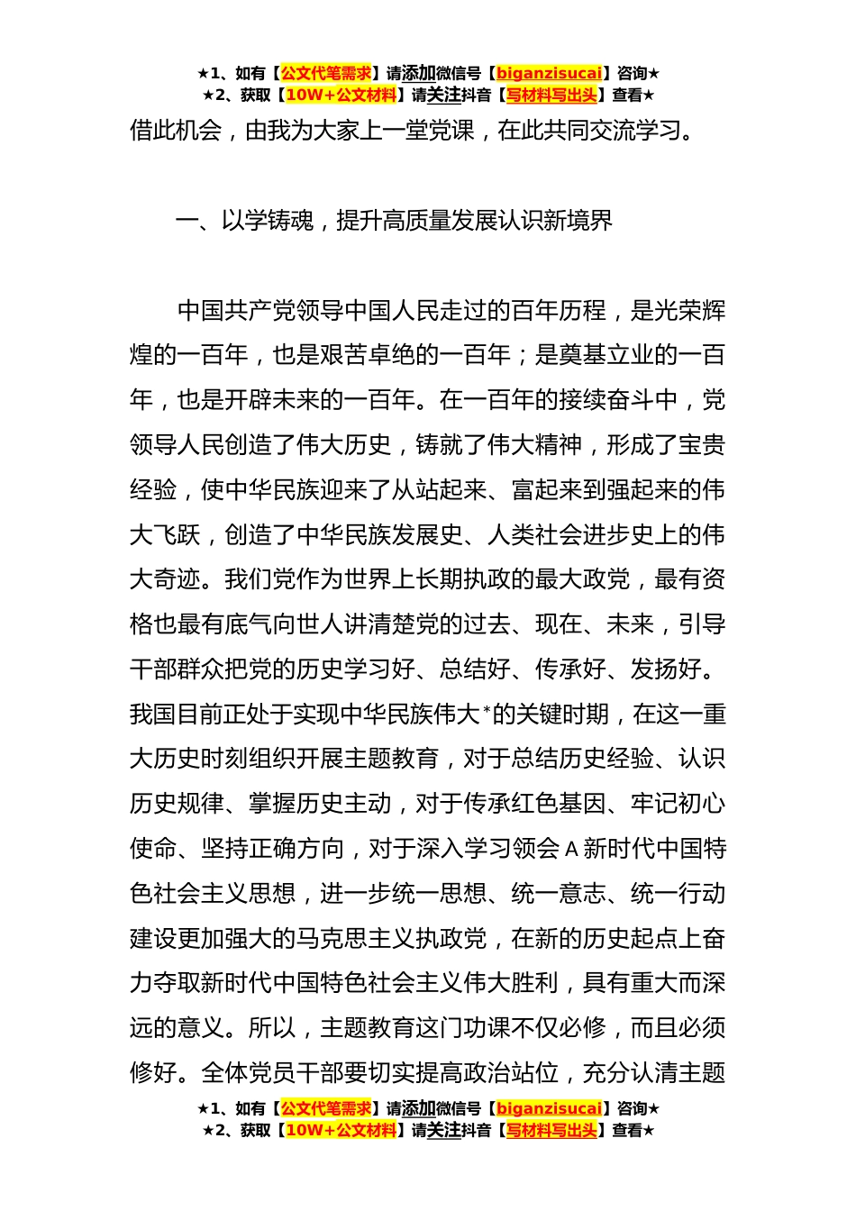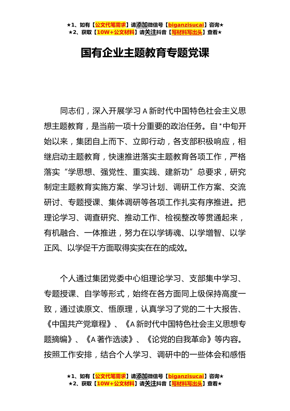 ★1、如有【公文代笔需求】请添加微信号【biganzisucai】咨询★★2、获取【10W+公文材料】请关注抖音【写材料写出头】查看★国有企业主题教育专题党课同志们,深入开展学习A新时代中国特色社会主义思想主题教育,是当前一项十分重要的政治任务。自*中旬开始以来,集团自上而下、立即行动,各支部积极响应,相继启动主题教育,快速推进落实主题教育各项工作,严格落实“学思想、强党性、重实践、建新功”总要求,研究制定主题教育实施方案、学习计划、调研工作方案、交流研讨、专题授课、集体调研等各项工作扎实有序推进。把理论学习、调查研究、推动工作、检视整改等贯通起来,有机融合、一体推进,努力在以学铸魂、以学增智、以学正风、以学促干方面取得实实在在的成效。个人通过集团党委中心组理论学习、支部集...