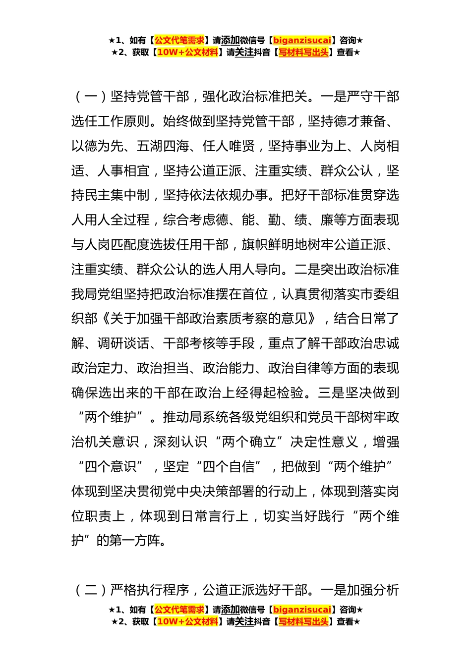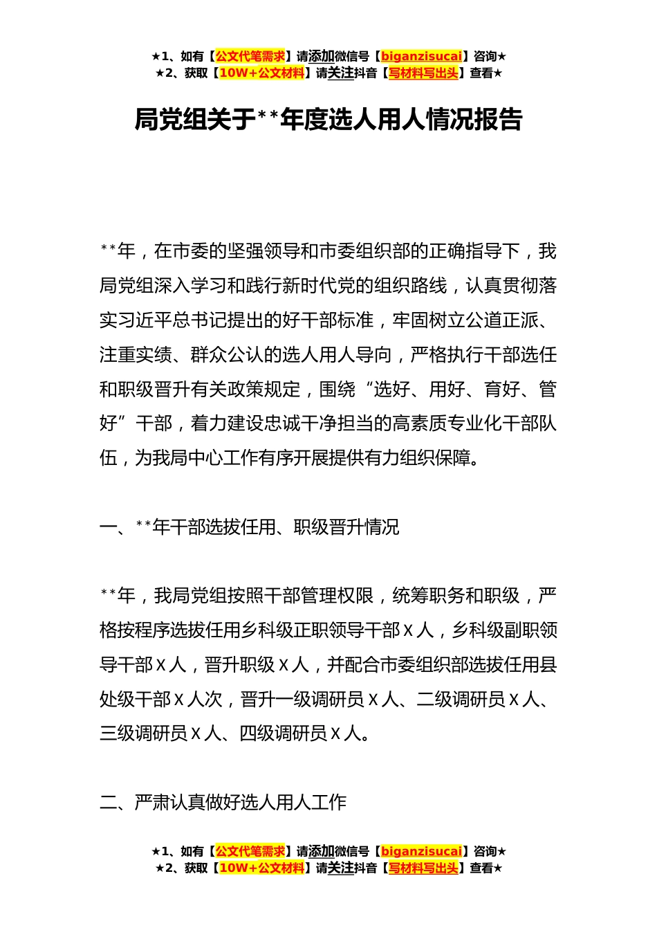 ★1、如有【公文代笔需求】请添加微信号【biganzisucai】咨询★★2、获取【10W+公文材料】请关注抖音【写材料写出头】查看★局党组关于**年度选人用人情况报告**年,在市委的坚强领导和市委组织部的正确指导下,我局党组深入学习和践行新时代党的组织路线,认真贯彻落实习近平总书记提出的好干部标准,牢固树立公道正派、注重实绩、群众公认的选人用人导向,严格执行干部选任和职级晋升有关政策规定,围绕“选好、用好、育好、管好”干部,着力建设忠诚干净担当的高素质专业化干部队伍,为我局中心工作有序开展提供有力组织保障。一、**年干部选拔任用、职级晋升情况**年,我局党组按照干部管理权限,统筹职务和职级,严格按程序选拔任用乡科级正职领导干部X人,乡科级副职领导干部X人,晋升职级X人,并配合市委组...