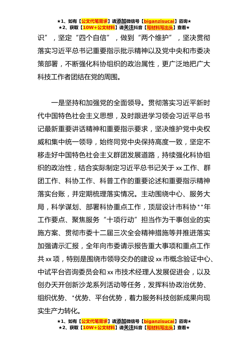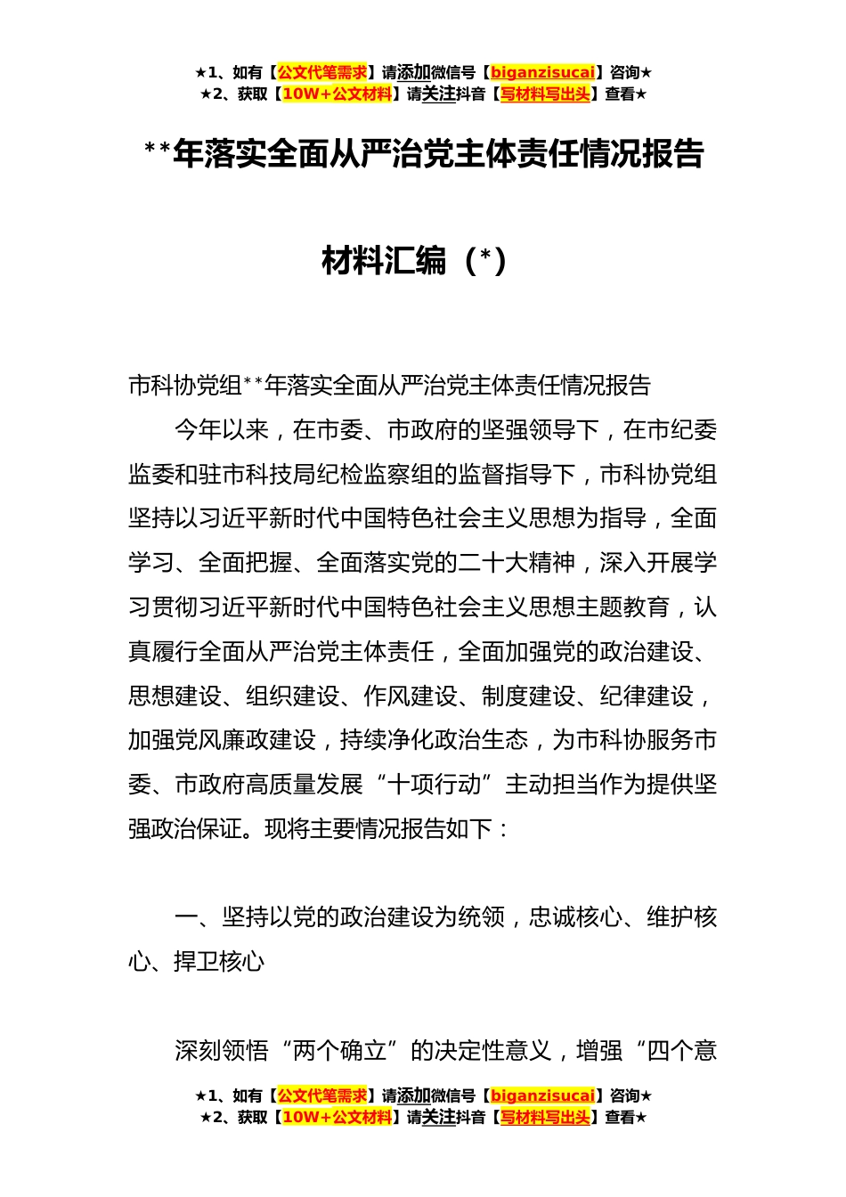 ★1、如有【公文代笔需求】请添加微信号【biganzisucai】咨询★★2、获取【10W+公文材料】请关注抖音【写材料写出头】查看★**年落实全面从严治党主体责任情况报告材料汇编(*)市科协党组**年落实全面从严治党主体责任情况报告今年以来,在市委、市政府的坚强领导下,在市纪委监委和驻市科技局纪检监察组的监督指导下,市科协党组坚持以习近平新时代中国特色社会主义思想为指导,全面学习、全面把握、全面落实党的二十大精神,深入开展学习贯彻习近平新时代中国特色社会主义思想主题教育,认真履行全面从严治党主体责任,全面加强党的政治建设、思想建设、组织建设、作风建设、制度建设、纪律建设,加强党风廉政建设,持续净化政治生态,为市科协服务市委、市政府高质量发展“十项行动”主动担当作为提供坚强政治...