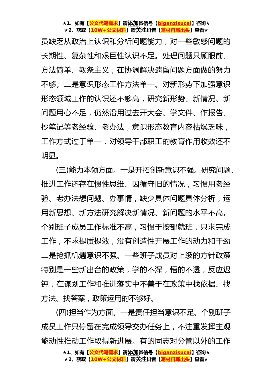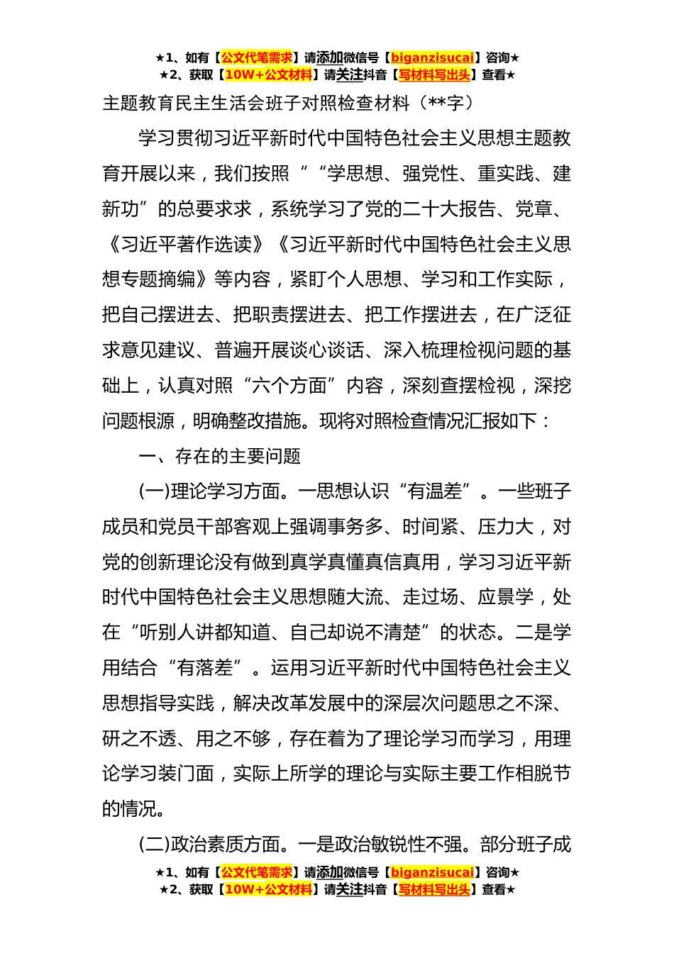 ★1、如有【公文代笔需求】请添加微信号【biganzisucai】咨询★★2、获取【10W+公文材料】请关注抖音【写材料写出头】查看★主题教育民主生活会班子对照检查材料(**字)学习贯彻习近平新时代中国特色社会主义思想主题教育开展以来,我们按照““学思想、强党性、重实践、建新功”的总要求求,系统学习了党的二十大报告、党章、《习近平著作选读》《习近平新时代中国特色社会主义思想专题摘编》等内容,紧盯个人思想、学习和工作实际,把自己摆进去、把职责摆进去、把工作摆进去,在广泛征求意见建议、普遍开展谈心谈话、深入梳理检视问题的基础上,认真对照“六个方面”内容,深刻查摆检视,深挖问题根源,明确整改措施。现将对照检查情况汇报如下:一、存在的主要问题(一)理论学习方面。一思想认识“有温差”。...