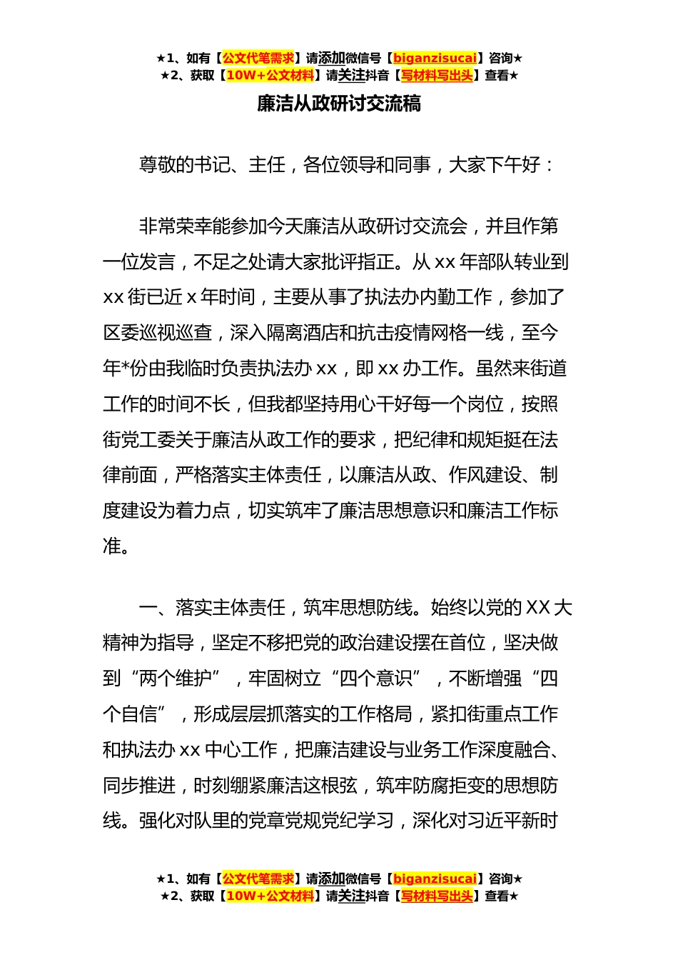 ★1、如有【公文代笔需求】请添加微信号【biganzisucai】咨询★★2、获取【10W+公文材料】请关注抖音【写材料写出头】查看★廉洁从政研讨交流稿尊敬的书记、主任,各位领导和同事,大家下午好:非常荣幸能参加今天廉洁从政研讨交流会,并且作第一位发言,不足之处请大家批评指正。从xx年部队转业到xx街已近x年时间,主要从事了执法办内勤工作,参加了区委巡视巡查,深入隔离酒店和抗击疫情网格一线,至今年*份由我临时负责执法办xx,即xx办工作。虽然来街道工作的时间不长,但我都坚持用心干好每一个岗位,按照街党工委关于廉洁从政工作的要求,把纪律和规矩挺在法律前面,严格落实主体责任,以廉洁从政、作风建设、制度建设为着力点,切实筑牢了廉洁思想意识和廉洁工作标准。一、落实主体责任,筑牢思想防线。始...