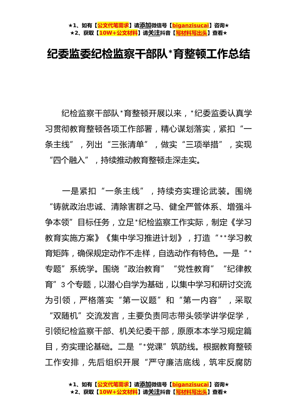 ★1、如有【公文代笔需求】请添加微信号【biganzisucai】咨询★★2、获取【10W+公文材料】请关注抖音【写材料写出头】查看★纪委监委纪检监察干部队*育整顿工作总结纪检监察干部队*育整顿开展以来,*纪委监委认真学习贯彻教育整顿各项工作部署,精心谋划落实,紧扣“一条主线”,列出“三张清单”,做实“三项举措”,实现“四个融入”,持续推动教育整顿走深走实。一是紧扣“一条主线”,持续夯实理论武装。围绕“铸就政治忠诚、清除害群之马、健全严管体系、增强斗争本领”目标任务,立足*纪检监察工作实际,制定《学习教育实施方案》《集中学习推进计划》,打造“**学习教育矩阵,确保规定动作不走样,自选动作有特色。一是“*专题”系统学。围绕“政治教育”“党性教育”“纪律教育”3个专题,以潜心自学为基...
