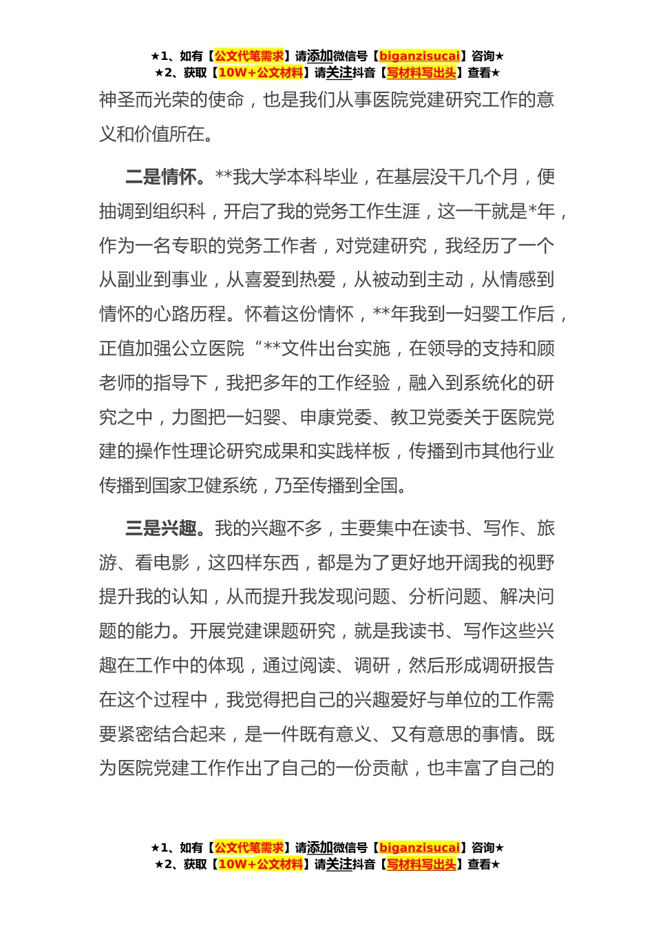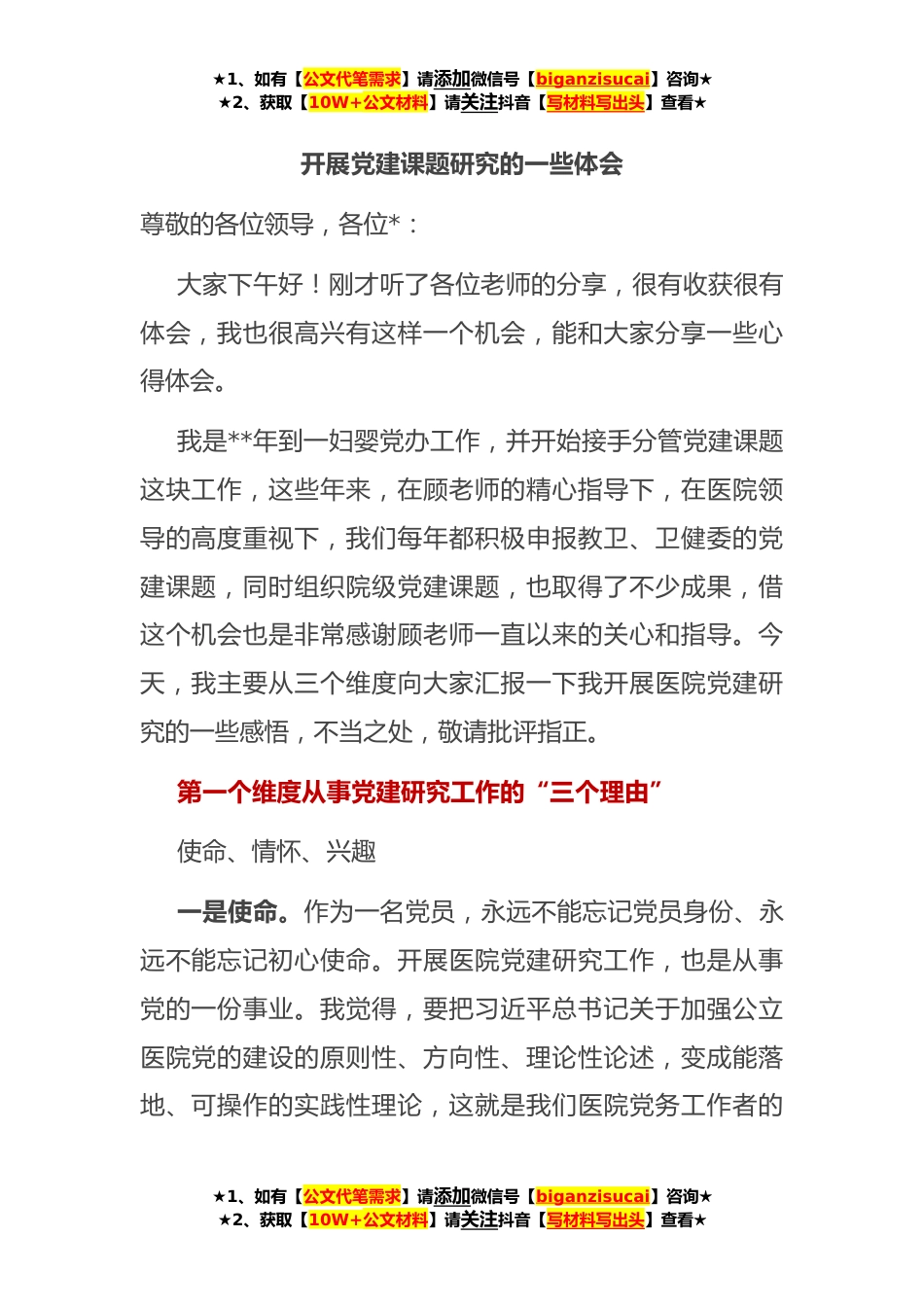 ★1、如有【公文代笔需求】请添加微信号【biganzisucai】咨询★★2、获取【10W+公文材料】请关注抖音【写材料写出头】查看★开展党建课题研究的一些体会尊敬的各位领导,各位*:大家下午好!刚才听了各位老师的分享,很有收获很有体会,我也很高兴有这样一个机会,能和大家分享一些心得体会。我是**年到一妇婴党办工作,并开始接手分管党建课题这块工作,这些年来,在顾老师的精心指导下,在医院领导的高度重视下,我们每年都积极申报教卫、卫健委的党建课题,同时组织院级党建课题,也取得了不少成果,借这个机会也是非常感谢顾老师一直以来的关心和指导。今天,我主要从三个维度向大家汇报一下我开展医院党建研究的一些感悟,不当之处,敬请批评指正。第一个维度从事党建研究工作的“三个理由”使命、情怀、兴趣...