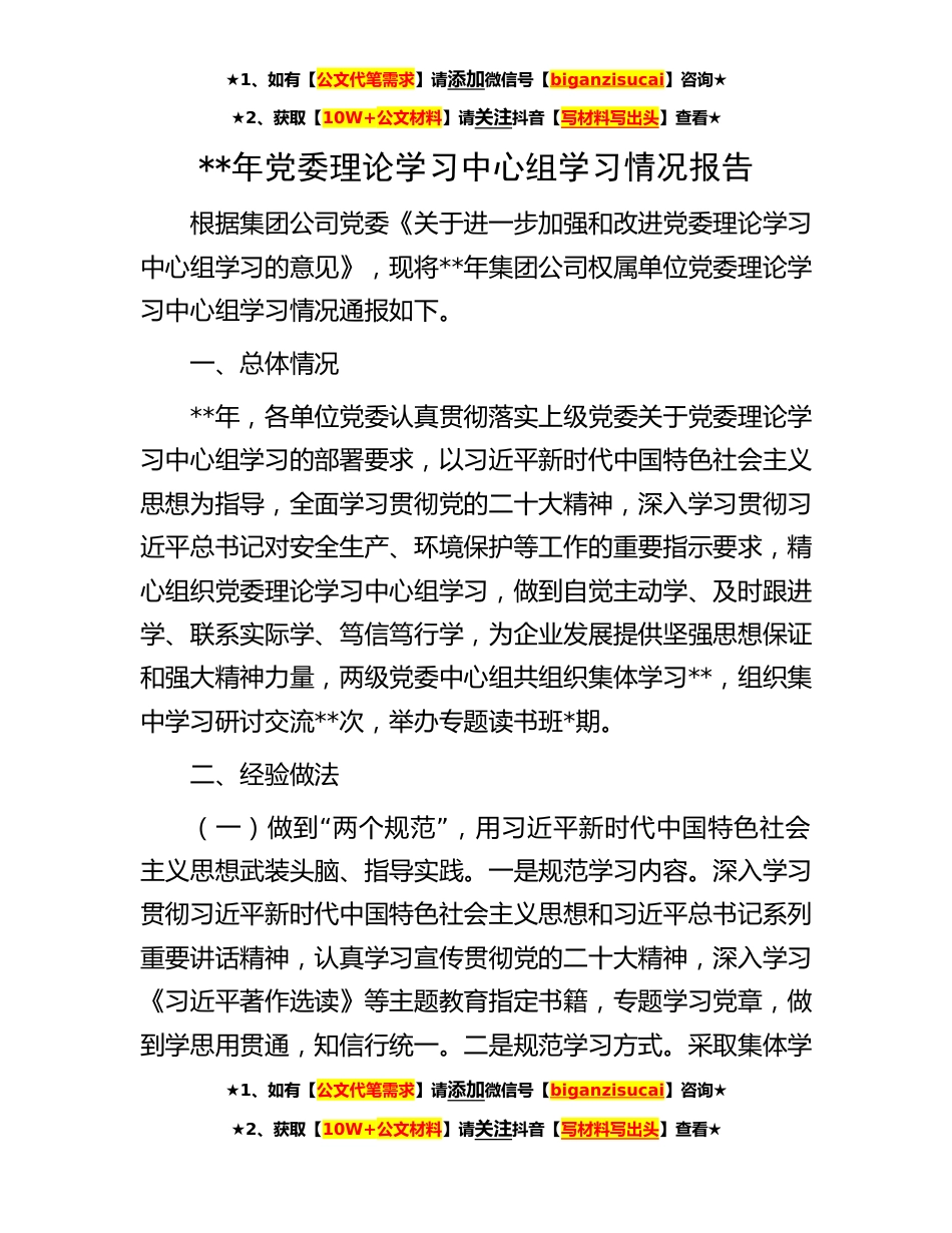 ★1、如有【公文代笔需求】请添加微信号【biganzisucai】咨询★★2、获取【10W+公文材料】请关注抖音【写材料写出头】查看★**年党委理论学习中心组学习情况报告根据集团公司党委《关于进一步加强和改进党委理论学习中心组学习的意见》,现将**年集团公司权属单位党委理论学习中心组学习情况通报如下。一、总体情况**年,各单位党委认真贯彻落实上级党委关于党委理论学习中心组学习的部署要求,以习近平新时代中国特色社会主义思想为指导,全面学习贯彻党的二十大精神,深入学习贯彻习近平总书记对安全生产、环境保护等工作的重要指示要求,精心组织党委理论学习中心组学习,做到自觉主动学、及时跟进学、联系实际学、笃信笃行学,为企业发展提供坚强思想保证和强大精神力量,两级党委中心组共组织集体学习**,组...