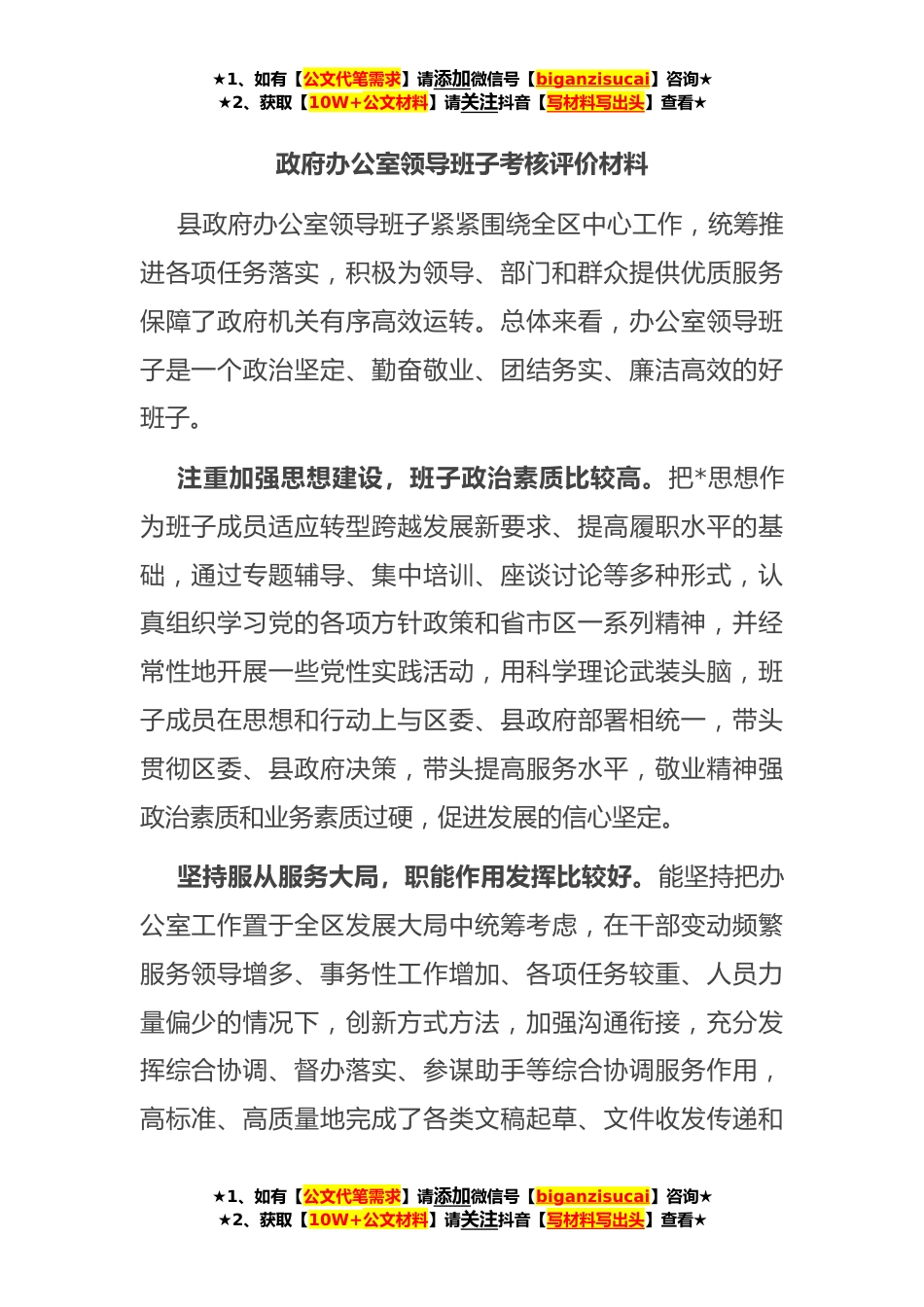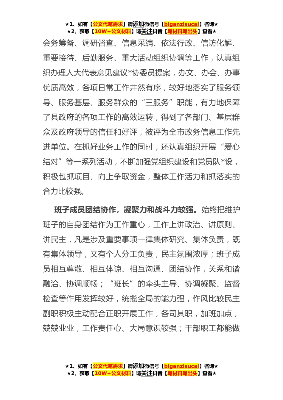 ★1、如有【公文代笔需求】请添加微信号【biganzisucai】咨询★★2、获取【10W+公文材料】请关注抖音【写材料写出头】查看★政府办公室领导班子考核评价材料县政府办公室领导班子紧紧围绕全区中心工作,统筹推进各项任务落实,积极为领导、部门和群众提供优质服务保障了政府机关有序高效运转。总体来看,办公室领导班子是一个政治坚定、勤奋敬业、团结务实、廉洁高效的好班子。注重加强思想建设,班子政治素质比较高。把*思想作为班子成员适应转型跨越发展新要求、提高履职水平的基础,通过专题辅导、集中培训、座谈讨论等多种形式,认真组织学习党的各项方针政策和省市区一系列精神,并经常性地开展一些党性实践活动,用科学理论武装头脑,班子成员在思想和行动上与区委、县政府部署相统一,带头贯彻区委、县政府...