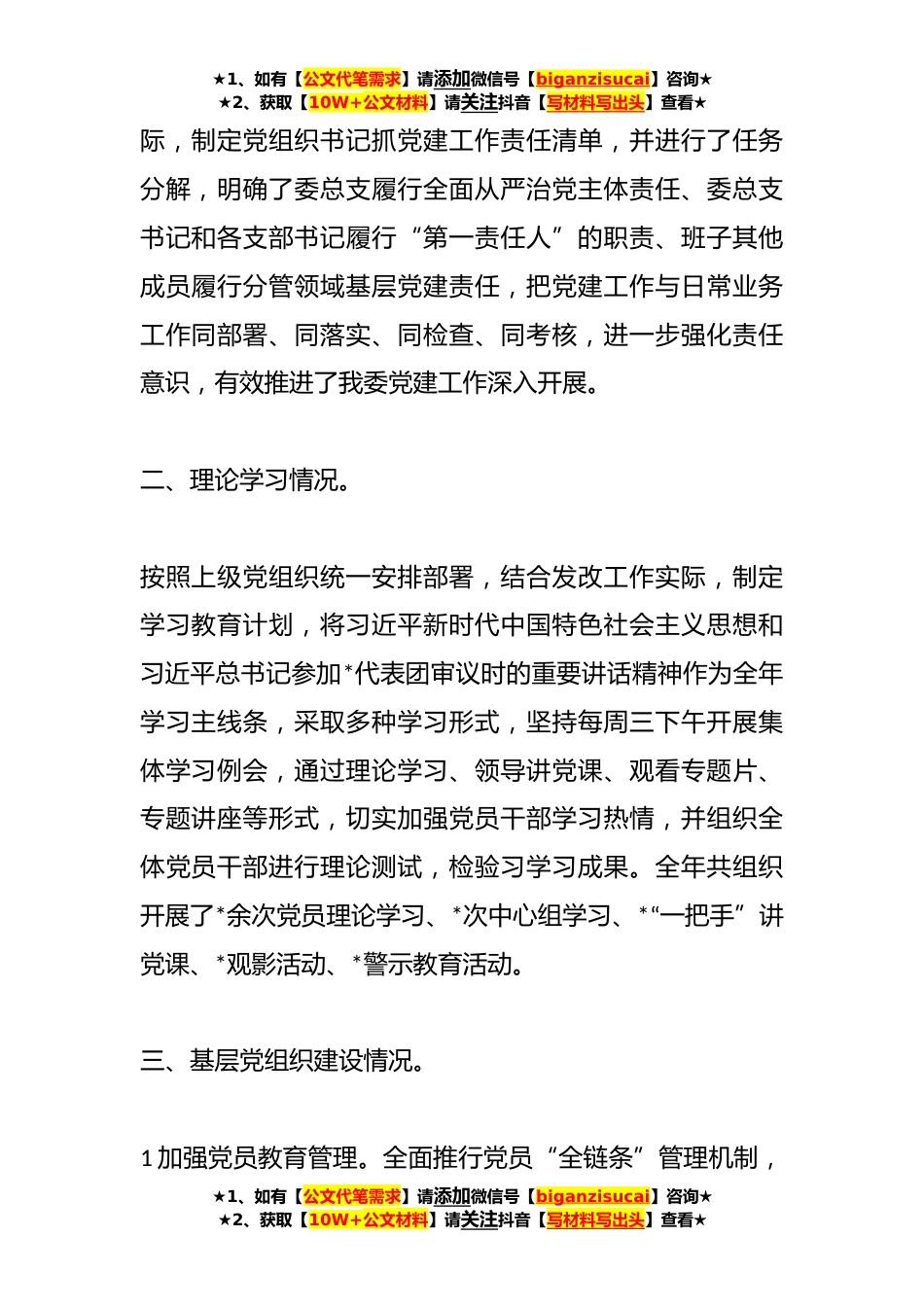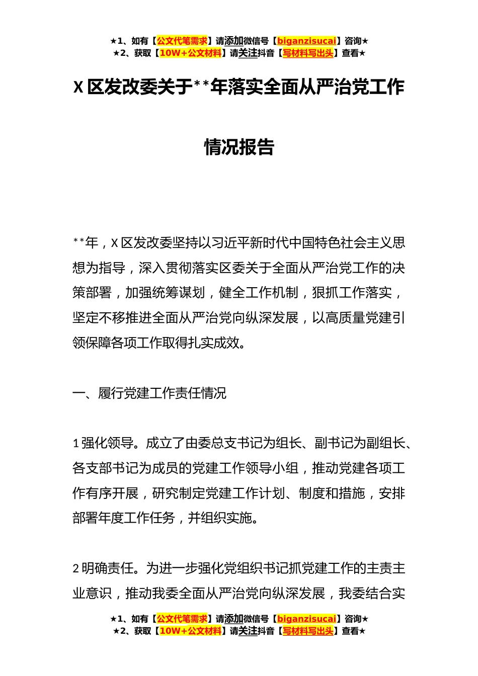 ★1、如有【公文代笔需求】请添加微信号【biganzisucai】咨询★★2、获取【10W+公文材料】请关注抖音【写材料写出头】查看★X区发改委关于**年落实全面从严治党工作情况报告**年,X区发改委坚持以习近平新时代中国特色社会主义思想为指导,深入贯彻落实区委关于全面从严治党工作的决策部署,加强统筹谋划,健全工作机制,狠抓工作落实,坚定不移推进全面从严治党向纵深发展,以高质量党建引领保障各项工作取得扎实成效。一、履行党建工作责任情况1强化领导。成立了由委总支书记为组长、副书记为副组长、各支部书记为成员的党建工作领导小组,推动党建各项工作有序开展,研究制定党建工作计划、制度和措施,安排部署年度工作任务,并组织实施。2明确责任。为进一步强化党组织书记抓党建工作的主责主业意识,推动我...