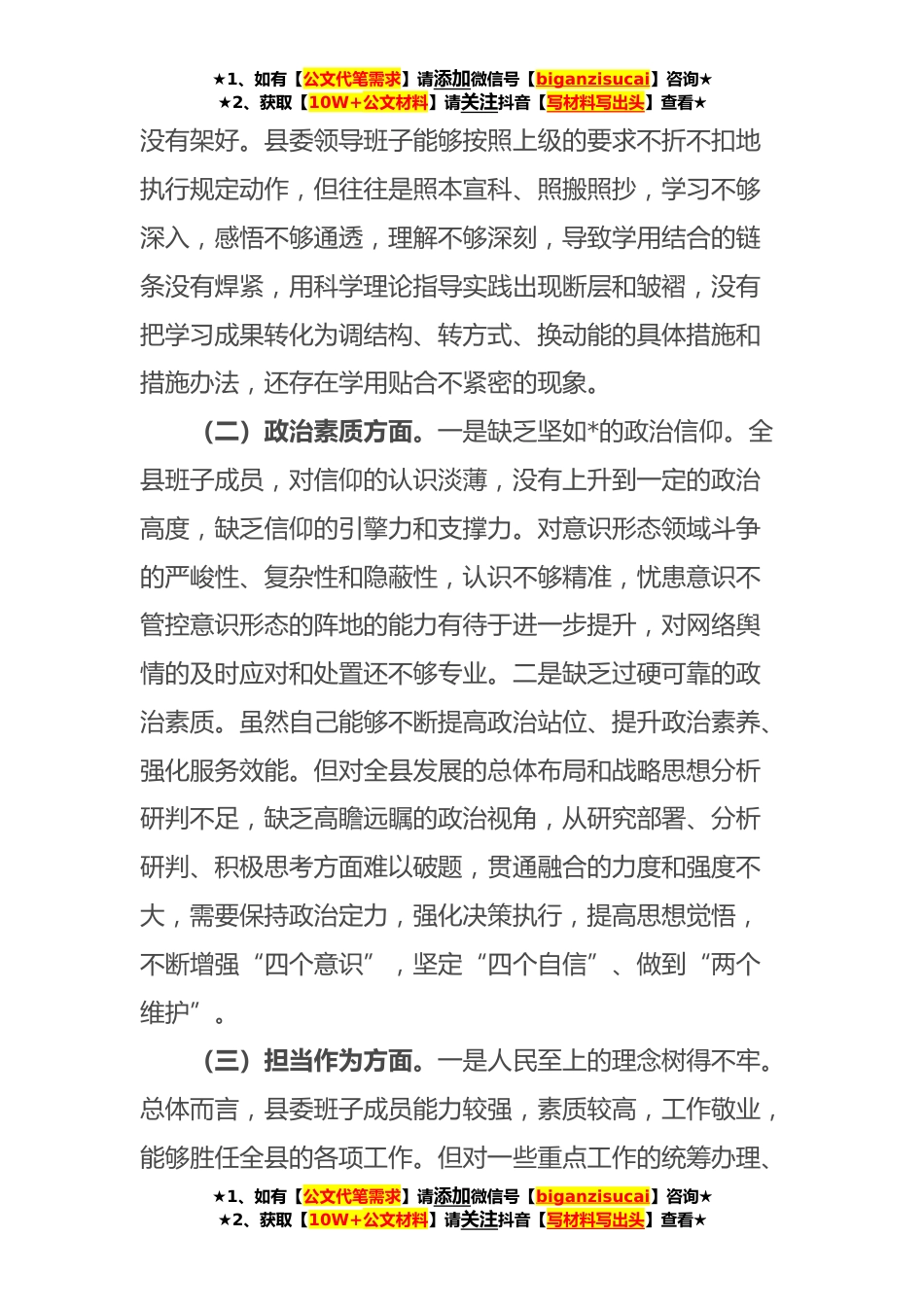 ★1、如有【公文代笔需求】请添加微信号【biganzisucai】咨询★★2、获取【10W+公文材料】请关注抖音【写材料写出头】查看★县委领导班子第二批主题教育专题民主生活会个人对照检查材料按照省市委关于开展**年度专题民主生活会的统一安排部署,县委领导班子紧扣严、实、细的标准,系统、全面、深入地学习习近平新时代中国特色社会主义思想、习近平总书记系列重要讲话精神等。在此基础上,紧密结合思想、工作和生活实际,深入开展谈心谈话,广泛征求意见建议,聚焦“六个方面”的主题,查摆存在的问题,深刻剖析原因,制定整改措施,形成了对照检查材料。现作如下对照检查。一、存在的主要问题(一)理论学习方面。一是理论学习的标杆拉升不够。县委班子虽然能够按照上级的部署和要求循规蹈矩地遵守和执行,做到学...