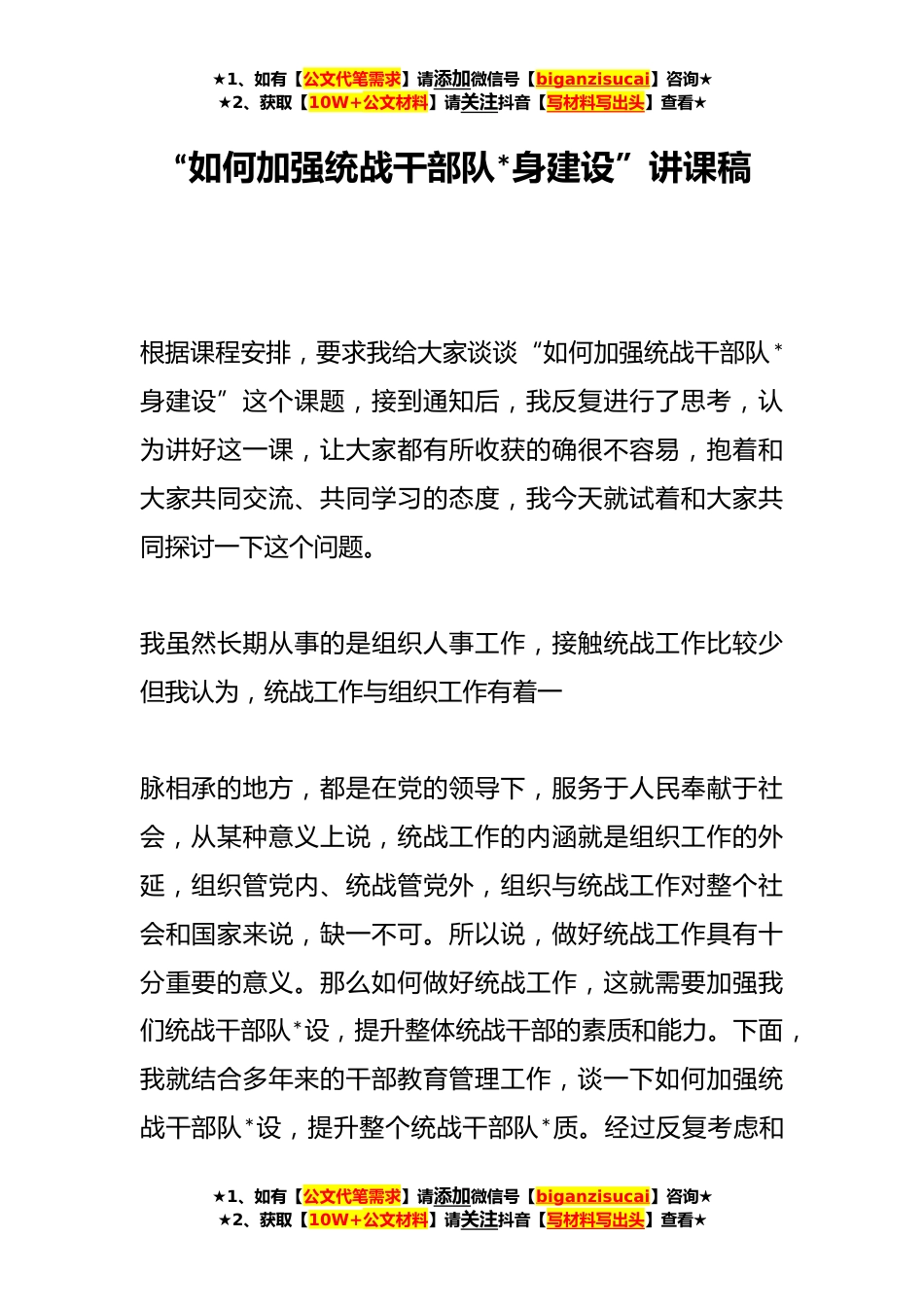 ★1、如有【公文代笔需求】请添加微信号【biganzisucai】咨询★★2、获取【10W+公文材料】请关注抖音【写材料写出头】查看★“如何加强统战干部队*身建设”讲课稿根据课程安排,要求我给大家谈谈“如何加强统战干部队*身建设”这个课题,接到通知后,我反复进行了思考,认为讲好这一课,让大家都有所收获的确很不容易,抱着和大家共同交流、共同学习的态度,我今天就试着和大家共同探讨一下这个问题。我虽然长期从事的是组织人事工作,接触统战工作比较少但我认为,统战工作与组织工作有着一脉相承的地方,都是在党的领导下,服务于人民奉献于社会,从某种意义上说,统战工作的内涵就是组织工作的外延,组织管党内、统战管党外,组织与统战工作对整个社会和国家来说,缺一不可。所以说,做好统战工作具有十分重要...