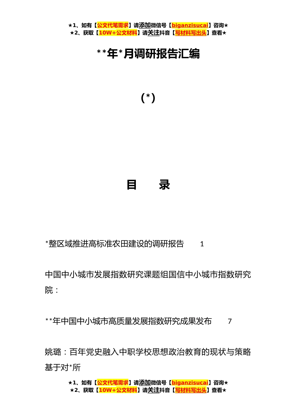 ★1、如有【公文代笔需求】请添加微信号【biganzisucai】咨询★★2、获取【10W+公文材料】请关注抖音【写材料写出头】查看★**年*月调研报告汇编(*)目录*整区域推进高标准农田建设的调研报告1中国中小城市发展指数研究课题组国信中小城市指数研究院:**年中国中小城市高质量发展指数研究成果发布7姚璐:百年党史融入中职学校思想政治教育的现状与策略基于对*所★1、如有【公文代笔需求】请添加微信号【biganzisucai】咨询★★2、获取【10W+公文材料】请关注抖音【写材料写出头】查看★★1、如有【公文代笔需求】请添加微信号【biganzisucai】咨询★★2、获取【10W+公文材料】请关注抖音【写材料写出头】查看★中职学校的调研分析**日报调研组:打造温暖社区,让幸福生活触手可及*建设“*分钟社区生活圈”的探索...