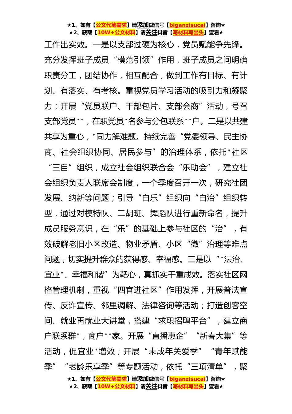 ★1、如有【公文代笔需求】请添加微信号【biganzisucai】咨询★★2、获取【10W+公文材料】请关注抖音【写材料写出头】查看★城市社区党委工作汇报材料根据会议安排,现将社区有关情况汇报如下。一、工作开展情况(一)抓基层党建工作责任制方面。履行好基层党建“第一责任人”职责。落实“党委书记亲自抓”的责任。一是坚持定期召开党委会、居委监督和支部党员大会。二是增强党员学习活动的吸引力和凝聚力。开展“青年伴读”“党员两小时”等形式多样主题活动。三是严格党员教育管理,正风肃纪。通过开展学习贯彻习近平新时代中国特色社会主义思想主题教育,学习党的二十大精神,在政治*想上行动上始终同组织保持一致,自觉地用党的政策、纪律和国家法令法规来指导、约束自己。(二)五星支部创建工作方面。社区党...