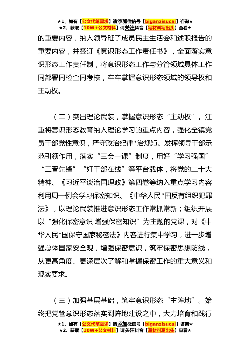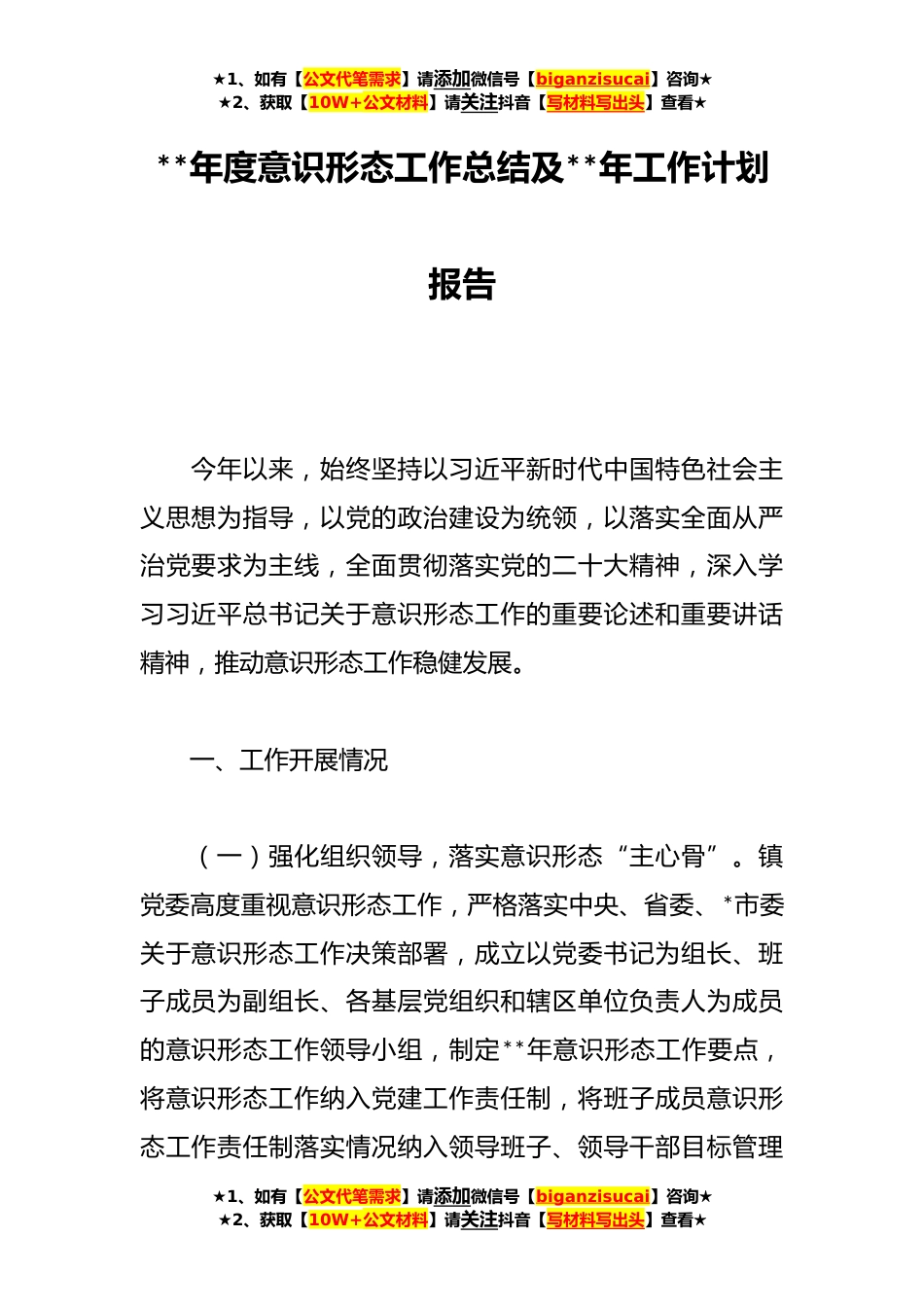 ★1、如有【公文代笔需求】请添加微信号【biganzisucai】咨询★★2、获取【10W+公文材料】请关注抖音【写材料写出头】查看★**年度意识形态工作总结及**年工作计划报告今年以来,始终坚持以习近平新时代中国特色社会主义思想为指导,以党的政治建设为统领,以落实全面从严治党要求为主线,全面贯彻落实党的二十大精神,深入学习习近平总书记关于意识形态工作的重要论述和重要讲话精神,推动意识形态工作稳健发展。一、工作开展情况(一)强化组织领导,落实意识形态“主心骨”。镇党委高度重视意识形态工作,严格落实中央、省委、*市委关于意识形态工作决策部署,成立以党委书记为组长、班子成员为副组长、各基层党组织和辖区单位负责人为成员的意识形态工作领导小组,制定**年意识形态工作要点,将意识形态工作纳...