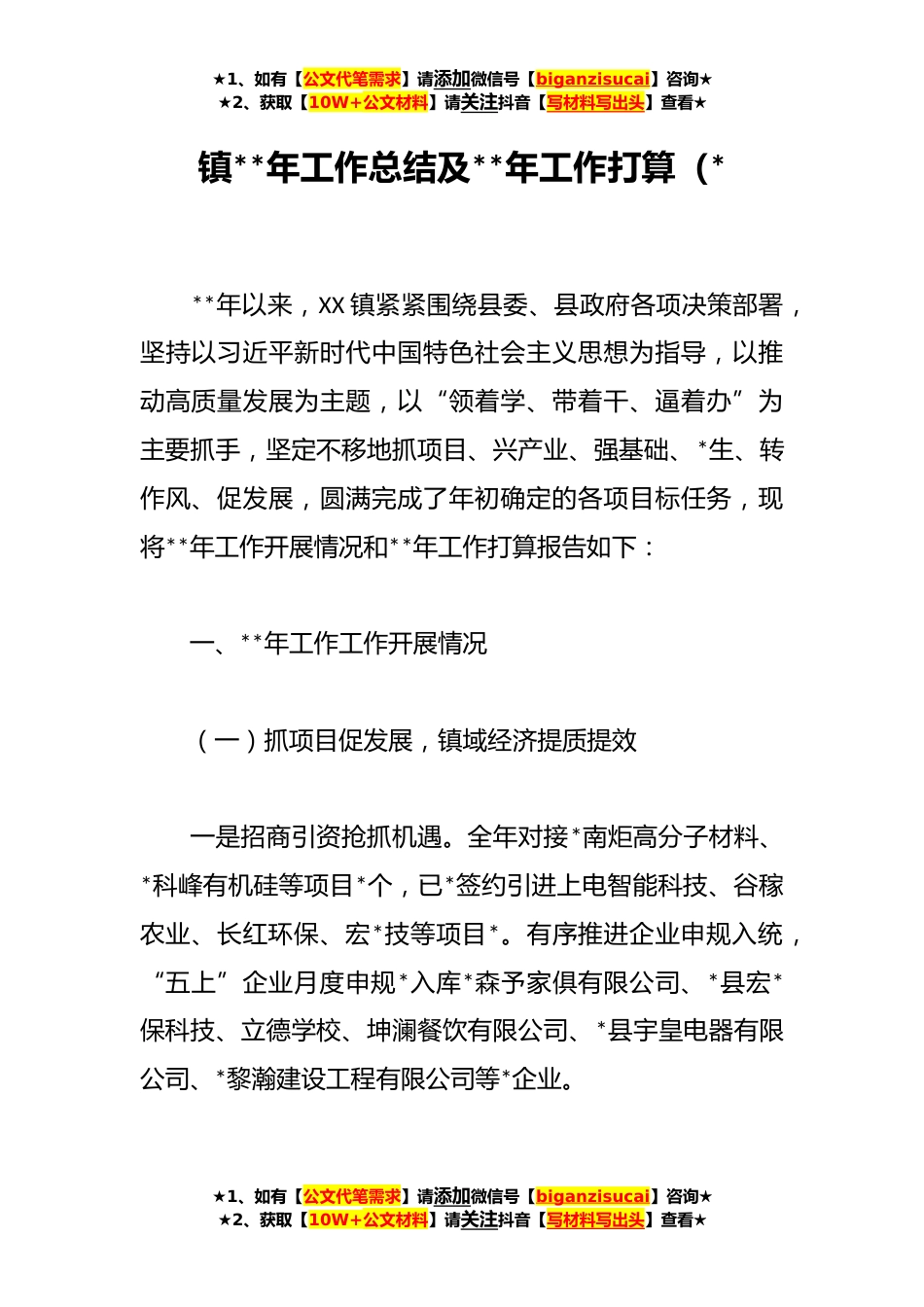 ★1、如有【公文代笔需求】请添加微信号【biganzisucai】咨询★★2、获取【10W+公文材料】请关注抖音【写材料写出头】查看★镇**年工作总结及**年工作打算(***年以来,XX镇紧紧围绕县委、县政府各项决策部署,坚持以习近平新时代中国特色社会主义思想为指导,以推动高质量发展为主题,以“领着学、带着干、逼着办”为主要抓手,坚定不移地抓项目、兴产业、强基础、*生、转作风、促发展,圆满完成了年初确定的各项目标任务,现将**年工作开展情况和**年工作打算报告如下:一、**年工作工作开展情况(一)抓项目促发展,镇域经济提质提效一是招商引资抢抓机遇。全年对接*南炬高分子材料、*科峰有机硅等项目*个,已*签约引进上电智能科技、谷稼农业、长红环保、宏*技等项目*。有序推进企业申规入统,“五上”企业月...