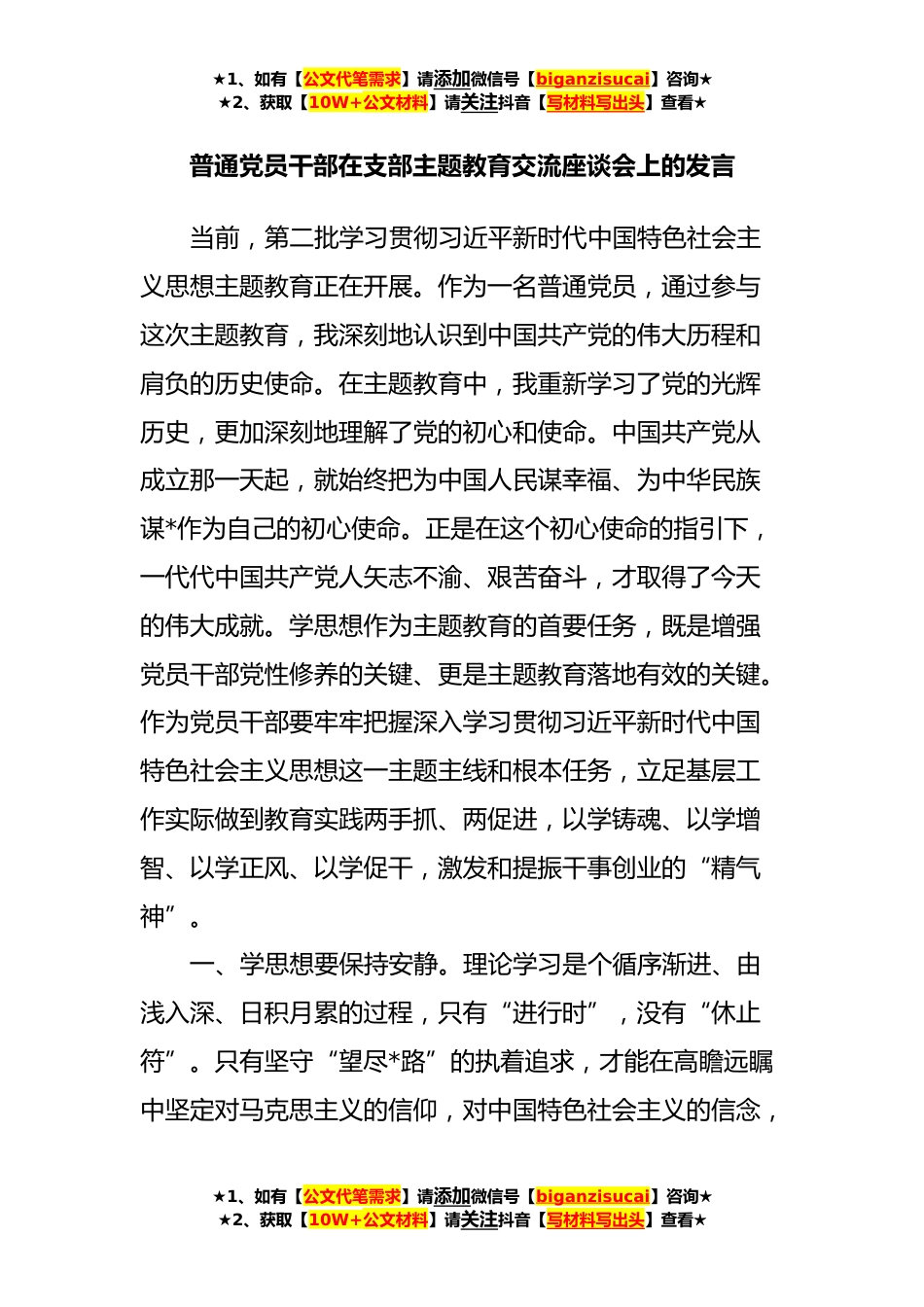 ★1、如有【公文代笔需求】请添加微信号【biganzisucai】咨询★★2、获取【10W+公文材料】请关注抖音【写材料写出头】查看★普通党员干部在支部主题教育交流座谈会上的发言当前,第二批学习贯彻习近平新时代中国特色社会主义思想主题教育正在开展。作为一名普通党员,通过参与这次主题教育,我深刻地认识到中国共产党的伟大历程和肩负的历史使命。在主题教育中,我重新学习了党的光辉历史,更加深刻地理解了党的初心和使命。中国共产党从成立那一天起,就始终把为中国人民谋幸福、为中华民族谋*作为自己的初心使命。正是在这个初心使命的指引下,一代代中国共产党人矢志不渝、艰苦奋斗,才取得了今天的伟大成就。学思想作为主题教育的首要任务,既是增强党员干部党性修养的关键、更是主题教育落地有效的关键。作为...