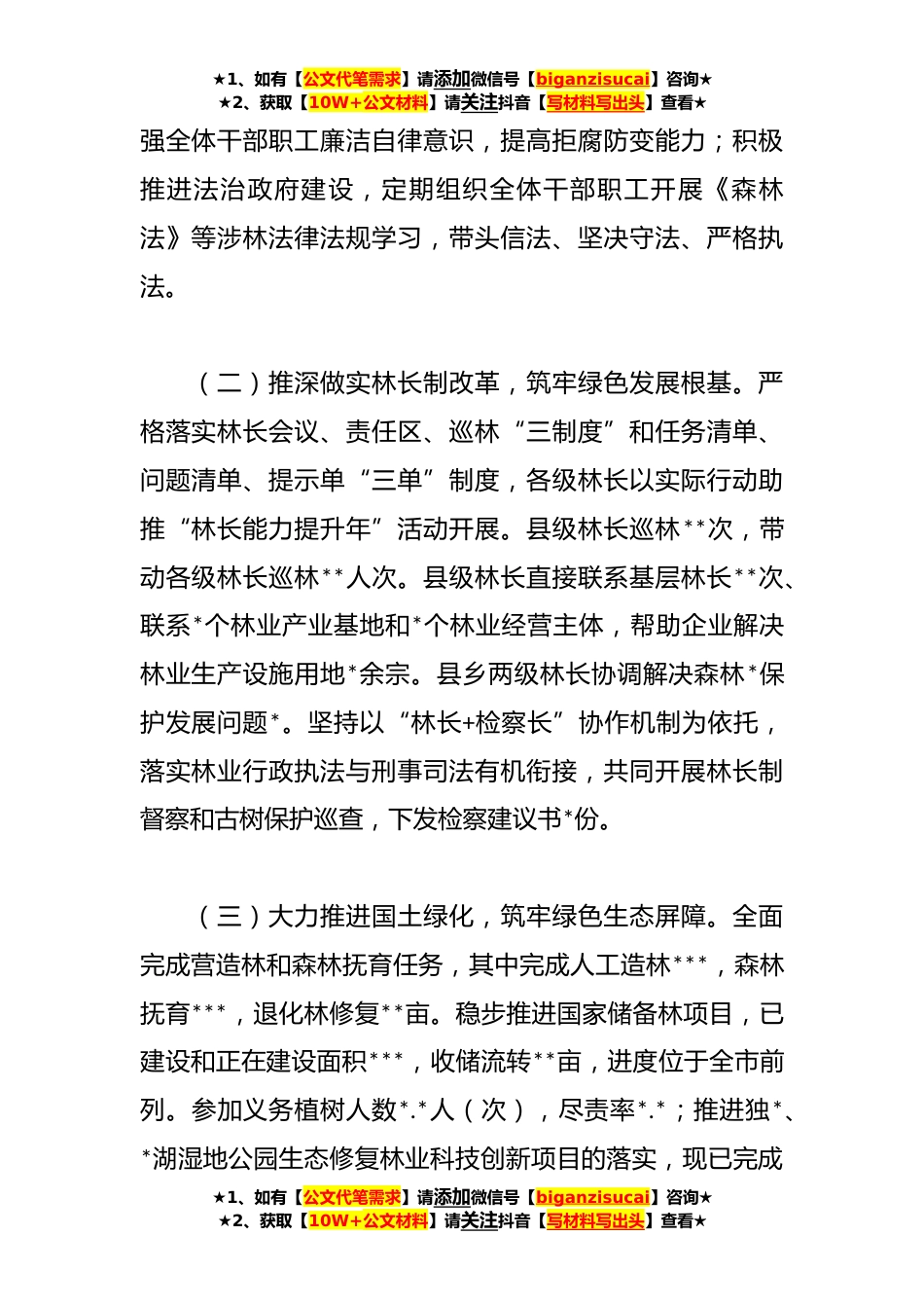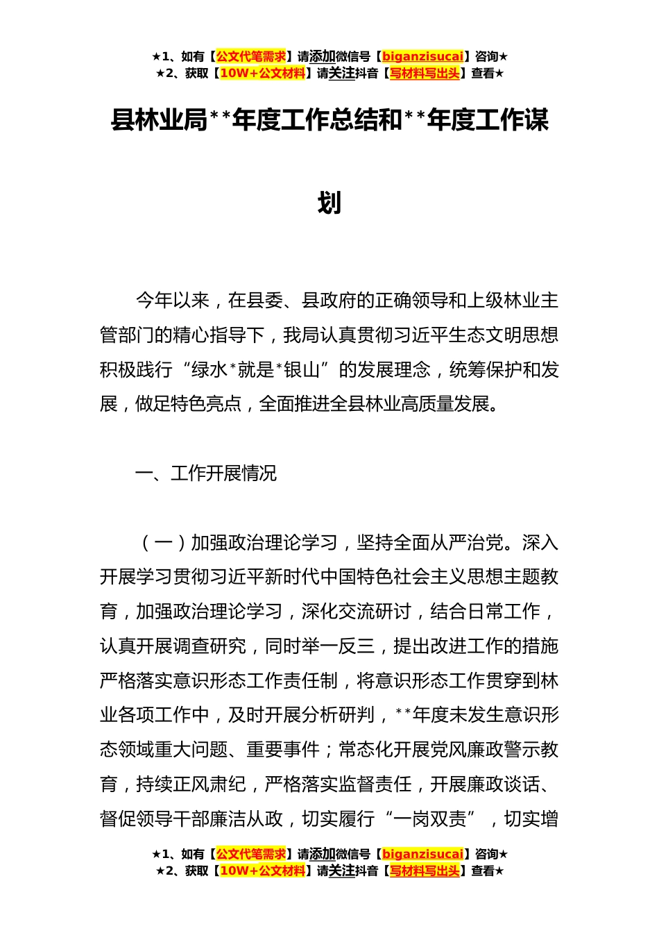 ★1、如有【公文代笔需求】请添加微信号【biganzisucai】咨询★★2、获取【10W+公文材料】请关注抖音【写材料写出头】查看★县林业局**年度工作总结和**年度工作谋划今年以来,在县委、县政府的正确领导和上级林业主管部门的精心指导下,我局认真贯彻习近平生态文明思想积极践行“绿水*就是*银山”的发展理念,统筹保护和发展,做足特色亮点,全面推进全县林业高质量发展。一、工作开展情况(一)加强政治理论学习,坚持全面从严治党。深入开展学习贯彻习近平新时代中国特色社会主义思想主题教育,加强政治理论学习,深化交流研讨,结合日常工作,认真开展调查研究,同时举一反三,提出改进工作的措施严格落实意识形态工作责任制,将意识形态工作贯穿到林业各项工作中,及时开展分析研判,**年度未发生意识形态领...