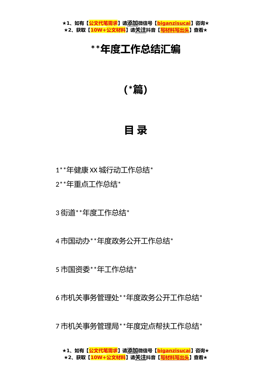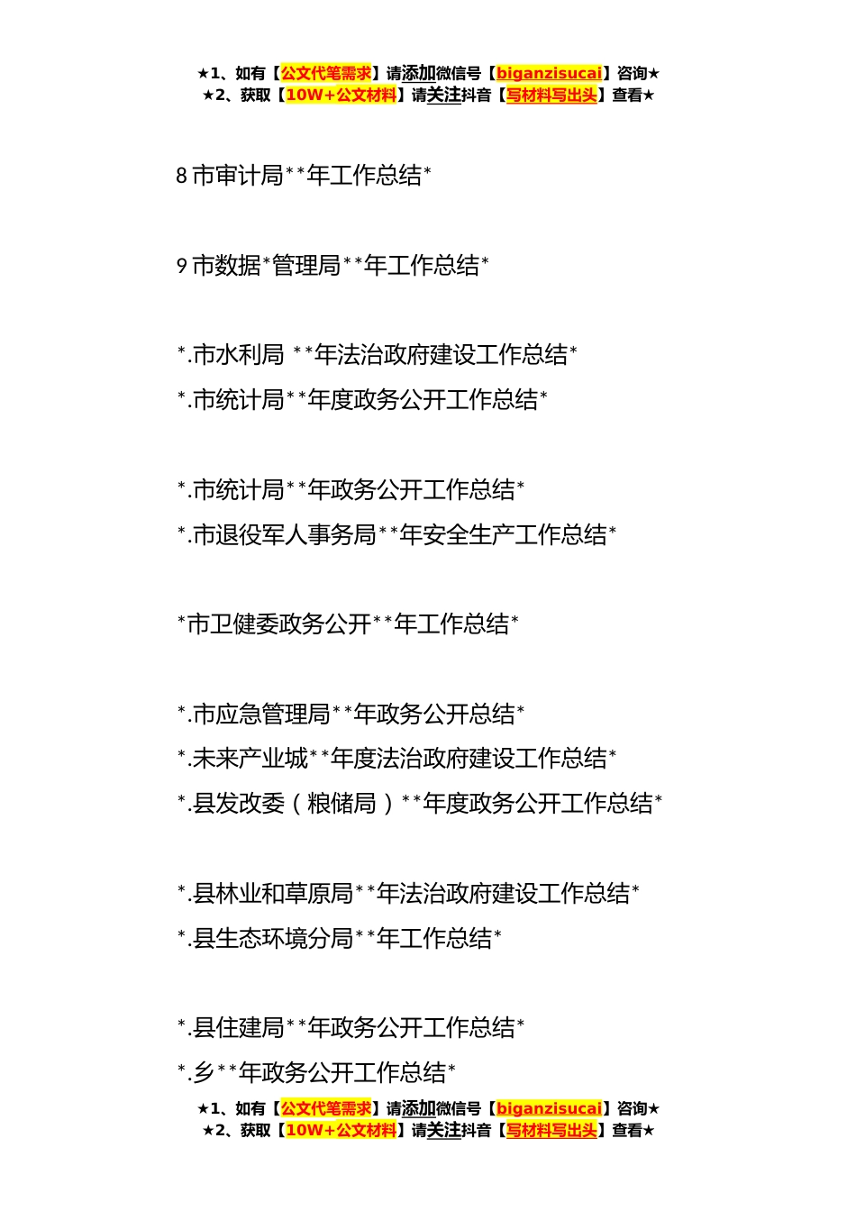 ★1、如有【公文代笔需求】请添加微信号【biganzisucai】咨询★★2、获取【10W+公文材料】请关注抖音【写材料写出头】查看★**年度工作总结汇编(*篇)目录1**年健康XX城行动工作总结*2**年重点工作总结*3街道**年度工作总结*4市国动办**年度政务公开工作总结*5市国资委**年工作总结*6市机关事务管理处**年度政务公开工作总结*7市机关事务管理局**年度定点帮扶工作总结*★1、如有【公文代笔需求】请添加微信号【biganzisucai】咨询★★2、获取【10W+公文材料】请关注抖音【写材料写出头】查看★★1、如有【公文代笔需求】请添加微信号【biganzisucai】咨询★★2、获取【10W+公文材料】请关注抖音【写材料写出头】查看★8市审计局**年工作总结*9市数据*管理局**年工作总结**.市水利局**年法治政府建设工作总结**.市...