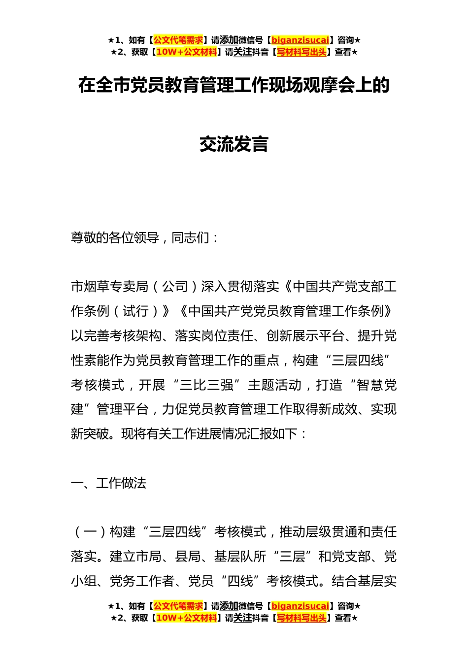 ★1、如有【公文代笔需求】请添加微信号【biganzisucai】咨询★★2、获取【10W+公文材料】请关注抖音【写材料写出头】查看★在全市党员教育管理工作现场观摩会上的交流发言尊敬的各位领导,同志们:市烟草专卖局(公司)深入贯彻落实《中国共产党支部工作条例(试行)》《中国共产党党员教育管理工作条例》以完善考核架构、落实岗位责任、创新展示平台、提升党性素能作为党员教育管理工作的重点,构建“三层四线”考核模式,开展“三比三强”主题活动,打造“智慧党建”管理平台,力促党员教育管理工作取得新成效、实现新突破。现将有关工作进展情况汇报如下:一、工作做法(一)构建“三层四线”考核模式,推动层级贯通和责任落实。建立市局、县局、基层队所“三层”和党支部、党小组、党务工作者、党员“四线”...