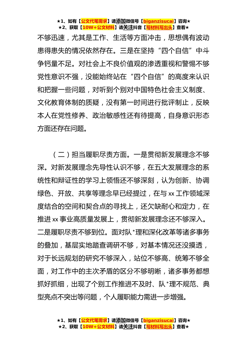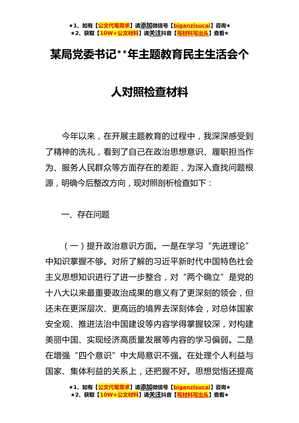 ★1、如有【公文代笔需求】请添加微信号【biganzisucai】咨询★★2、获取【10W+公文材料】请关注抖音【写材料写出头】查看★某局党委书记**年主题教育民主生活会个人对照检查材料今年以来,在开展主题教育的过程中,我深深感受到了精神的洗礼,看到了自己在政治思想意识、履职担当作为、服务人民群众等方面存在的差距,为深入查找问题根源,明确今后整改方向,现对照剖析检查如下:一、存在问题(一)提升政治意识方面。一是在学习“先进理论”中知识掌握不够。对所了解的习近平新时代中国特色社会主义思想知识进行了进一步整合,对“两个确立”是党的十八大以来最重要政治成果的意义有了更深刻的领会,但还未在更深层次、更高远的境界去深刻体会,对总体国家安全观、推进法治中国建设等内容学得掌握较深,对构建...