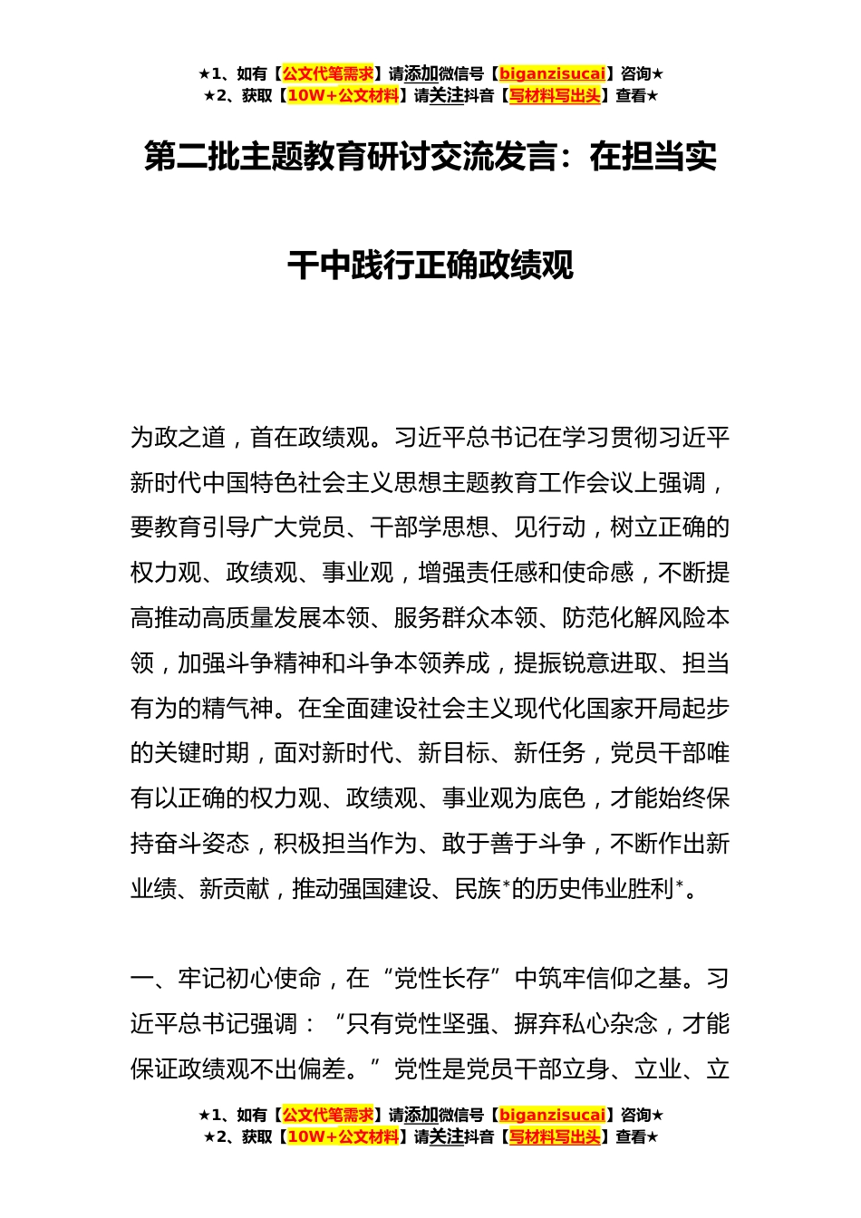 ★1、如有【公文代笔需求】请添加微信号【biganzisucai】咨询★★2、获取【10W+公文材料】请关注抖音【写材料写出头】查看★第二批主题教育研讨交流发言:在担当实干中践行正确政绩观为政之道,首在政绩观。习近平总书记在学习贯彻习近平新时代中国特色社会主义思想主题教育工作会议上强调,要教育引导广大党员、干部学思想、见行动,树立正确的权力观、政绩观、事业观,增强责任感和使命感,不断提高推动高质量发展本领、服务群众本领、防范化解风险本领,加强斗争精神和斗争本领养成,提振锐意进取、担当有为的精气神。在全面建设社会主义现代化国家开局起步的关键时期,面对新时代、新目标、新任务,党员干部唯有以正确的权力观、政绩观、事业观为底色,才能始终保持奋斗姿态,积极担当作为、敢于善于斗争,不...