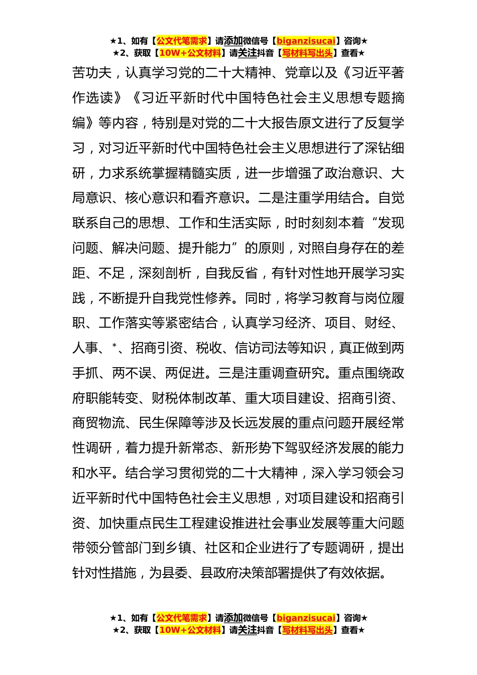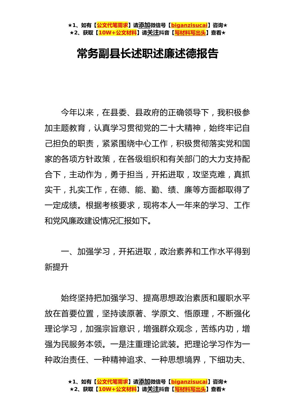 ★1、如有【公文代笔需求】请添加微信号【biganzisucai】咨询★★2、获取【10W+公文材料】请关注抖音【写材料写出头】查看★常务副县长述职述廉述德报告今年以来,在县委、县政府的正确领导下,我积极参加主题教育,认真学习贯彻党的二十大精神,始终牢记自己担负的职责,紧紧围绕中心工作,积极贯彻落实党和国家的各项方针政策,在各级组织和有关部门的大力支持配合下,主动作为,勇于担当,开拓进取,攻坚克难,真抓实干,扎实工作,在德、能、勤、绩、廉等方面都取得了一定成绩。根据考核要求,现将本人一年来的学习、工作和党风廉政建设情况汇报如下。一、加强学习,开拓进取,政治素养和工作水平得到新提升始终坚持把加强学习、提高思想政治素质和履职水平放在首要位置,坚持读原著、学原文、悟原理,不断强...