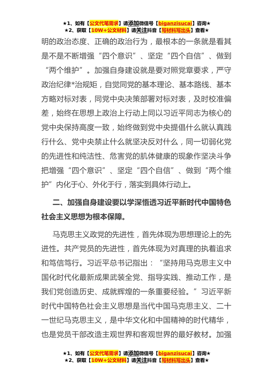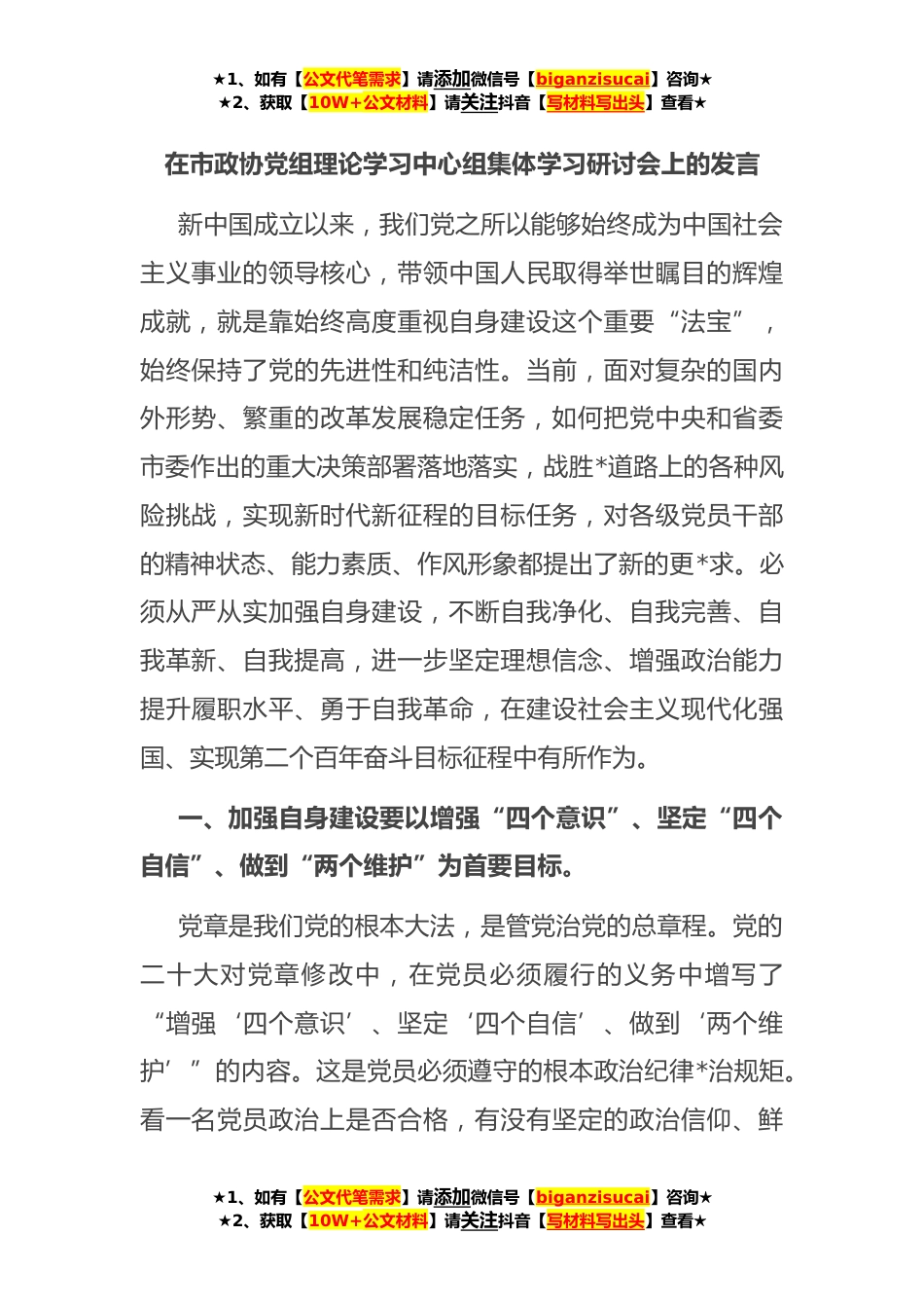 ★1、如有【公文代笔需求】请添加微信号【biganzisucai】咨询★★2、获取【10W+公文材料】请关注抖音【写材料写出头】查看★在市政协党组理论学习中心组集体学习研讨会上的发言新中国成立以来,我们党之所以能够始终成为中国社会主义事业的领导核心,带领中国人民取得举世瞩目的辉煌成就,就是靠始终高度重视自身建设这个重要“法宝”,始终保持了党的先进性和纯洁性。当前,面对复杂的国内外形势、繁重的改革发展稳定任务,如何把党中央和省委市委作出的重大决策部署落地落实,战胜*道路上的各种风险挑战,实现新时代新征程的目标任务,对各级党员干部的精神状态、能力素质、作风形象都提出了新的更*求。必须从严从实加强自身建设,不断自我净化、自我完善、自我革新、自我提高,进一步坚定理想信念、增强政治能...