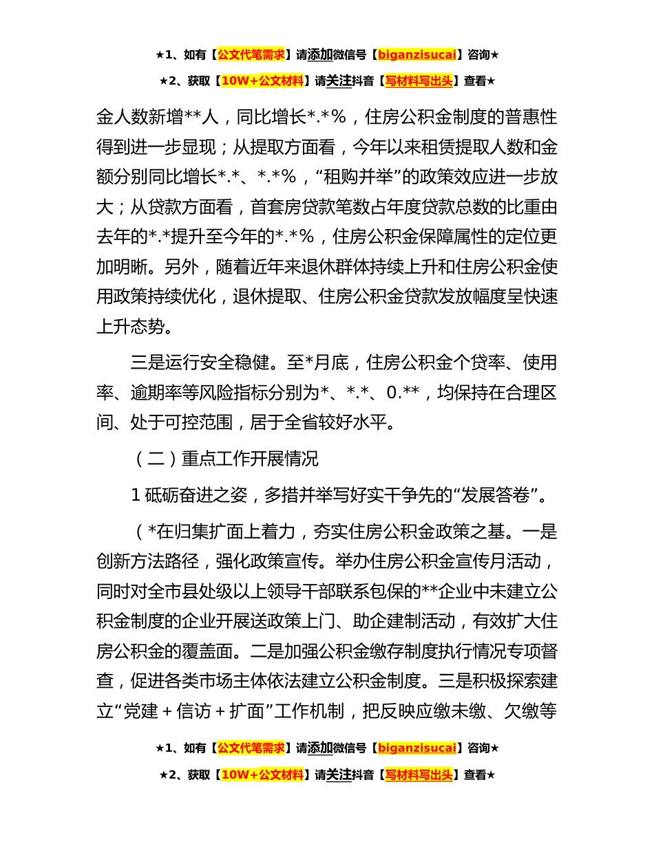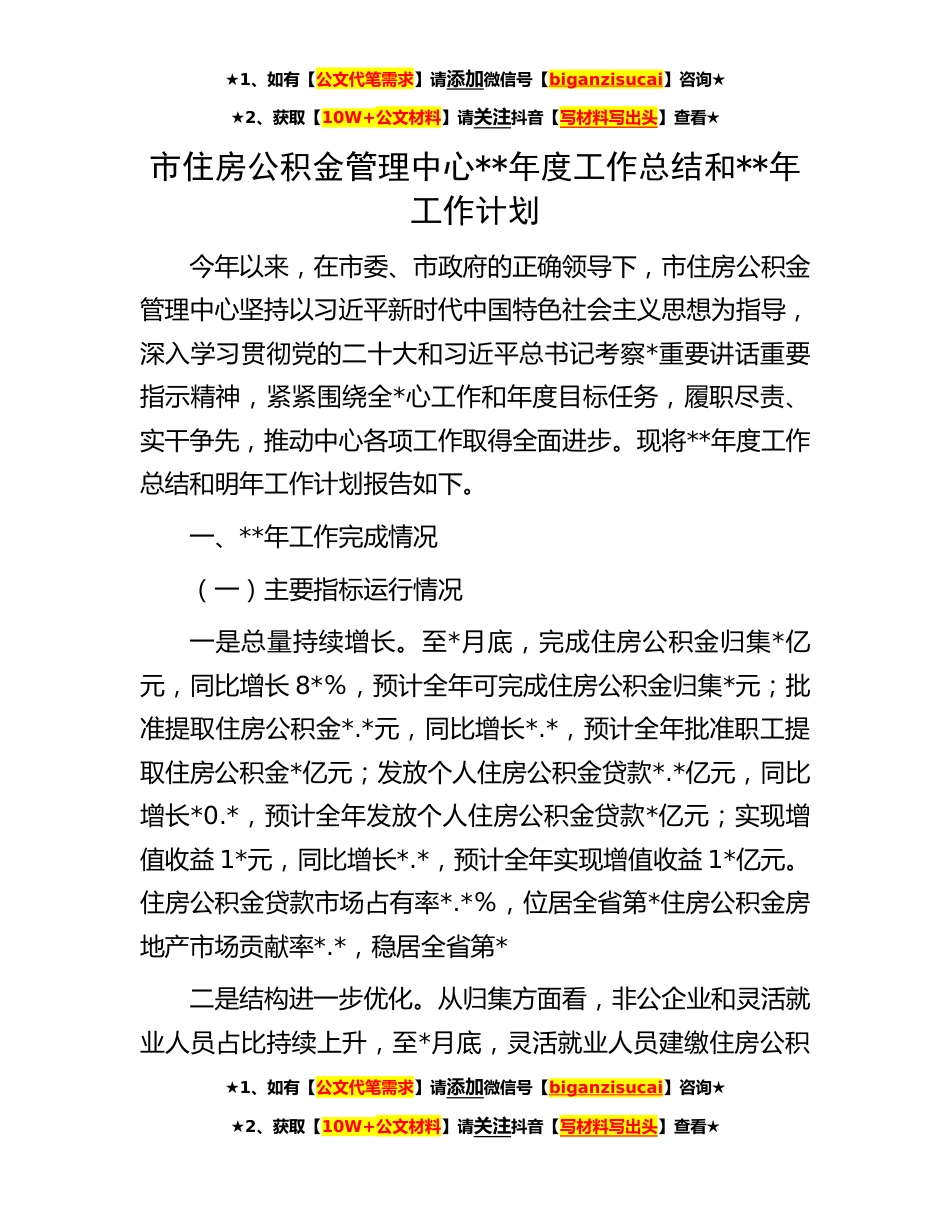 ★1、如有【公文代笔需求】请添加微信号【biganzisucai】咨询★★2、获取【10W+公文材料】请关注抖音【写材料写出头】查看★市住房公积金管理中心**年度工作总结和**年工作计划今年以来,在市委、市政府的正确领导下,市住房公积金管理中心坚持以习近平新时代中国特色社会主义思想为指导,深入学习贯彻党的二十大和习近平总书记考察*重要讲话重要指示精神,紧紧围绕全*心工作和年度目标任务,履职尽责、实干争先,推动中心各项工作取得全面进步。现将**年度工作总结和明年工作计划报告如下。一、**年工作完成情况(一)主要指标运行情况一是总量持续增长。至*月底,完成住房公积金归集*亿元,同比增长8*%,预计全年可完成住房公积金归集*元;批准提取住房公积金*.*元,同比增长*.*,预计全年批准职工提取住房公积...