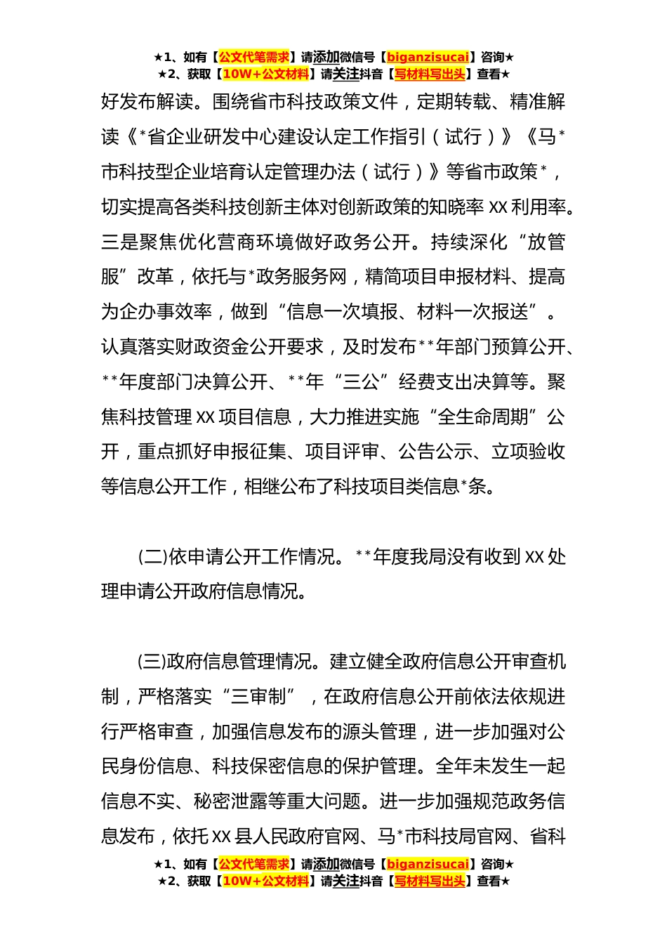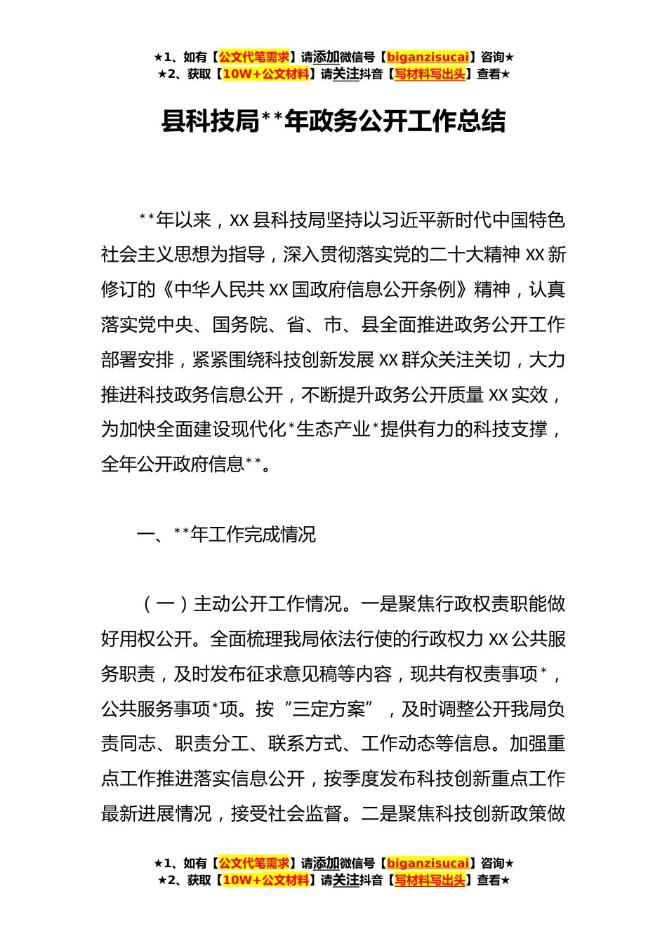 ★1、如有【公文代笔需求】请添加微信号【biganzisucai】咨询★★2、获取【10W+公文材料】请关注抖音【写材料写出头】查看★县科技局**年政务公开工作总结**年以来,XX县科技局坚持以习近平新时代中国特色社会主义思想为指导,深入贯彻落实党的二十大精神XX新修订的《中华人民共XX国政府信息公开条例》精神,认真落实党中央、国务院、省、市、县全面推进政务公开工作部署安排,紧紧围绕科技创新发展XX群众关注关切,大力推进科技政务信息公开,不断提升政务公开质量XX实效,为加快全面建设现代化*生态产业*提供有力的科技支撑,全年公开政府信息**。一、**年工作完成情况(一)主动公开工作情况。一是聚焦行政权责职能做好用权公开。全面梳理我局依法行使的行政权力XX公共服务职责,及时发布征求意见稿等内容,现...