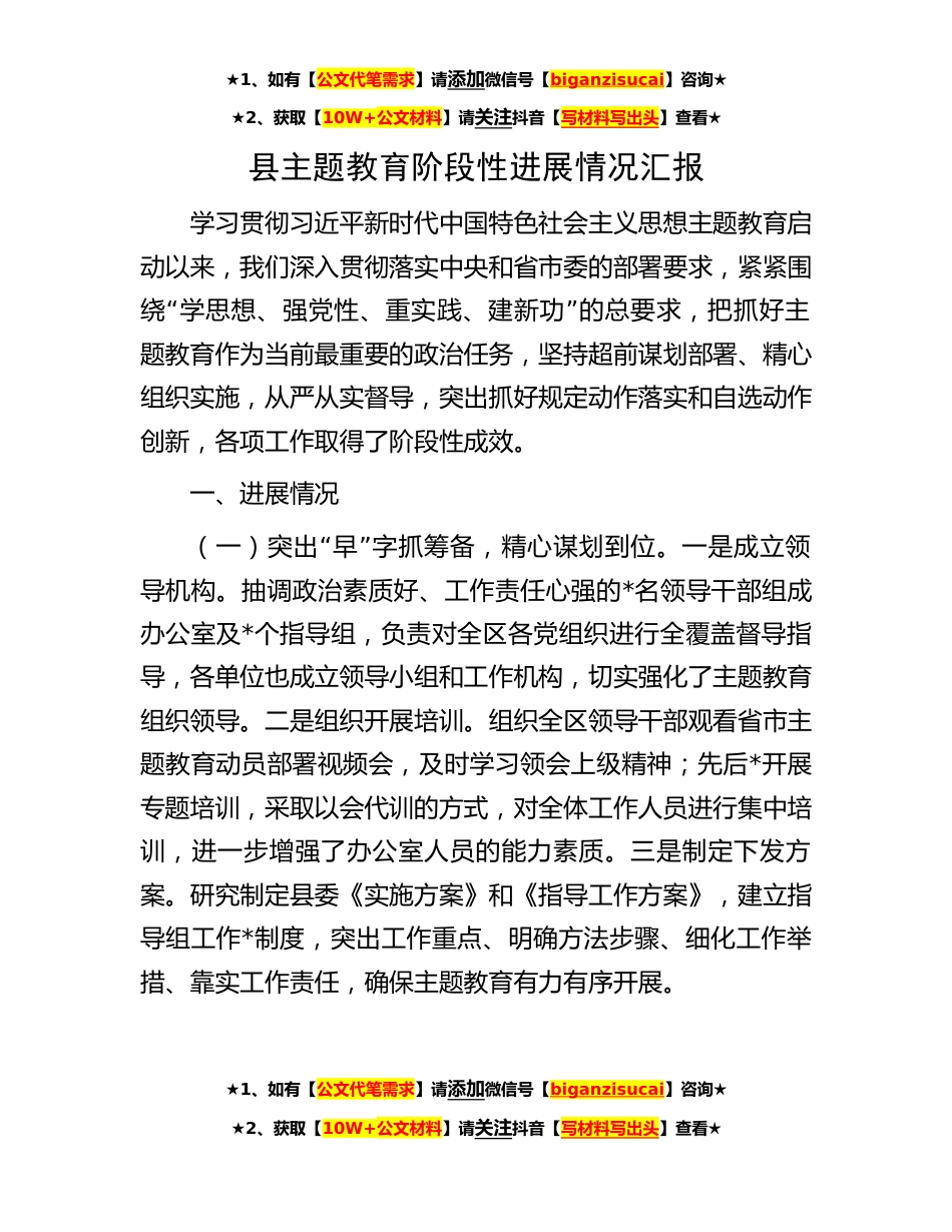 ★1、如有【公文代笔需求】请添加微信号【biganzisucai】咨询★★2、获取【10W+公文材料】请关注抖音【写材料写出头】查看★县主题教育阶段性进展情况汇报学习贯彻习近平新时代中国特色社会主义思想主题教育启动以来,我们深入贯彻落实中央和省市委的部署要求,紧紧围“”绕学思想、强党性、重实践、建新功的总要求,把抓好主题教育作为当前最重要的政治任务,坚持超前谋划部署、精心组织实施,从严从实督导,突出抓好规定动作落实和自选动作创新,各项工作取得了阶段性成效。一、进展情况“”(一)突出早字抓筹备,精心谋划到位。一是成立领导机构。抽调政治素质好、工作责任心强的*名领导干部组成办公室及*个指导组,负责对全区各党组织进行全覆盖督导指导,各单位也成立领导小组和工作机构,切实强化了主题教...