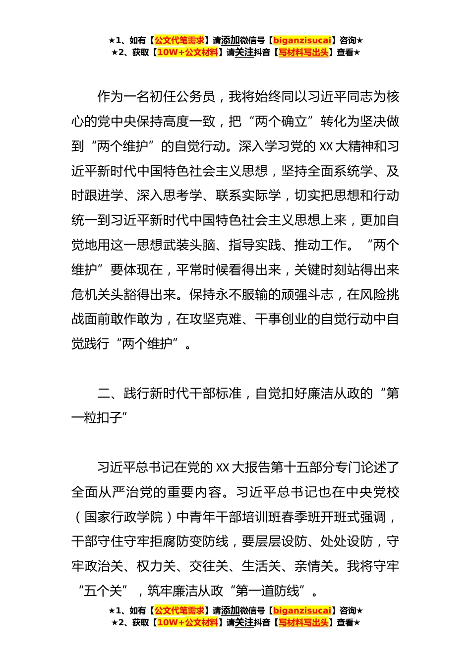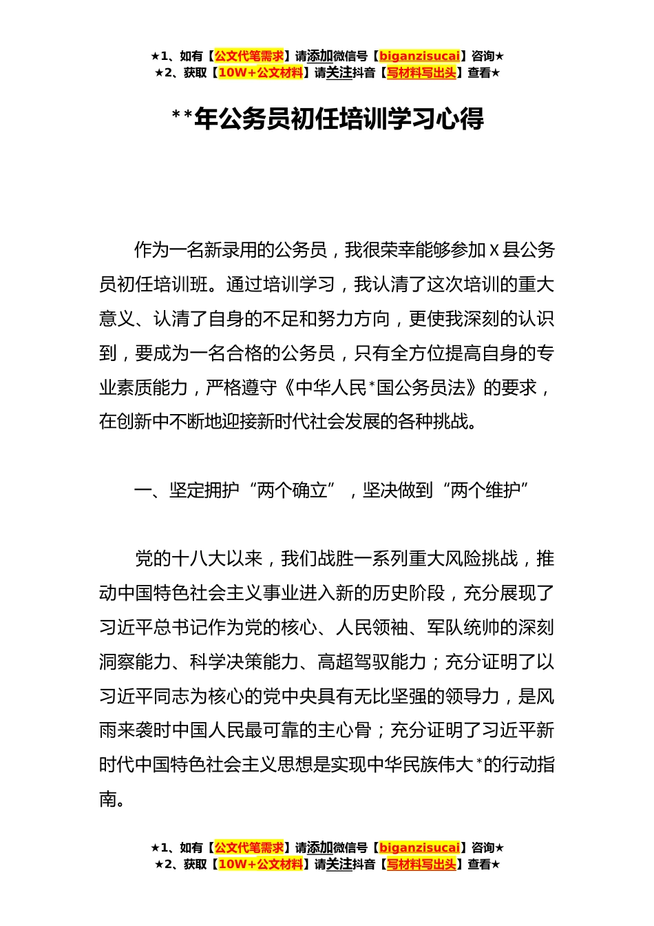 ★1、如有【公文代笔需求】请添加微信号【biganzisucai】咨询★★2、获取【10W+公文材料】请关注抖音【写材料写出头】查看★**年公务员初任培训学习心得作为一名新录用的公务员,我很荣幸能够参加X县公务员初任培训班。通过培训学习,我认清了这次培训的重大意义、认清了自身的不足和努力方向,更使我深刻的认识到,要成为一名合格的公务员,只有全方位提高自身的专业素质能力,严格遵守《中华人民*国公务员法》的要求,在创新中不断地迎接新时代社会发展的各种挑战。一、坚定拥护“两个确立”,坚决做到“两个维护”党的十八大以来,我们战胜一系列重大风险挑战,推动中国特色社会主义事业进入新的历史阶段,充分展现了习近平总书记作为党的核心、人民领袖、军队统帅的深刻洞察能力、科学决策能力、高超驾驭能力...
